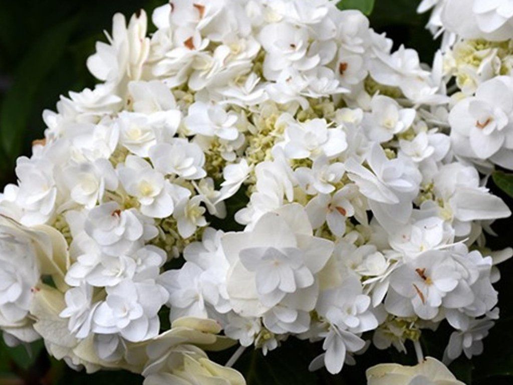 Bauernhortensie 'Wedding Gown' - ein bezaubernder und laubabwerfender Kultivar mit gefüllten Blüten. Der Strauch erreicht im ausgewachsenen Zustand eine Höhe von 1,2 m bei etwa gleicher Breite. Die Form ist kompakt. Von Juni bis Oktober bezaubert er mit einer reichen Blüte voller kleiner sternförmiger Blüten in reinweiß; die von kleineren gefüllten Blüten in grünlich bis weiß umgeben sind. Die Nadeln sind dunkelgrün. Dieser Strauch eignet sich hervorragend als Solitär, aber auch im Garten, im Beet oder auf der Terrasse. Die Bauernhortensie blüht am Holz des Vorjahres, daher entfernen wir im Frühjahr nur die durch Frost beschädigten Triebspitzen. Insgesamt ist die Hortensie ein beliebtes Element für Gärten und verleiht jedem Garten ein erhabenes und romantisches Flair.