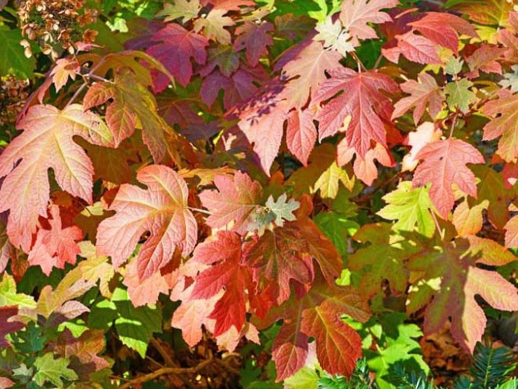Eichenblättrige Hortensie - ein interessanter Strauch, der Ihr Interesse fast das ganze Jahr über aufrechterhält. Sie bildet einen mittelgroßen, oft mehrstämmigen Strauch mit dichtem, abgerundetem Habitus. Er erreicht eine Höhe von 1,8 - 2,4 m bei gleicher Breite. Sie hat große, tief gelappte Blätter, die an Eichenblätter erinnern. Sie sind grün und färben sich im Herbst dunkelrot bis weinrot. Die Blüten sind in bis zu 30 cm lange Rispen angeordnet; sie sind kleiner, voll, cremeweiß; sie werden allmählich rosa. Bei älteren Sträuchern fällt auch die abblätternde, zimtbraune Rinde auf. Diese Hortensie ist ideal als Solitärpflanze, aber auch in Gruppenpflanzungen mit Stauden kommt sie gut zur Geltung. Insgesamt ist die Hortensie ein beliebtes Element für Gärten, das jedem Garten ein zartes Aussehen und eine Farbe verleiht.