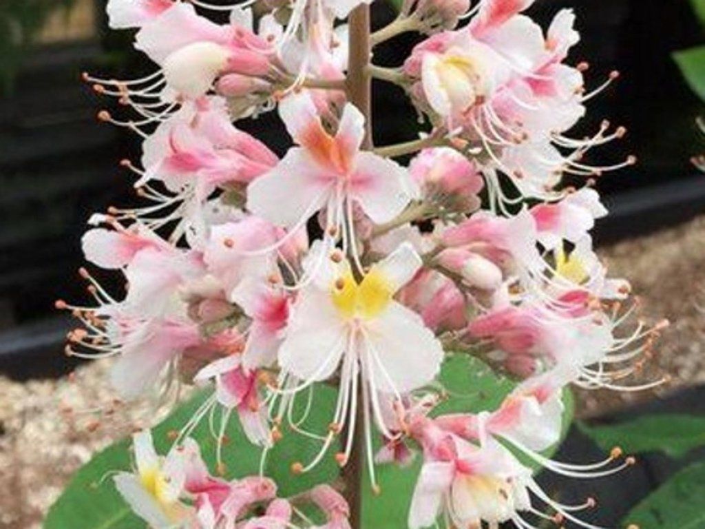 Indische Rosskastanie 'Sydney Pearce' - laubabwerfender Laubbaum. Im Erwachsenenalter erreicht er eine Höhe und Breite von 15 m. Die Blätter sind zusammengesetzt, 7-teilig, lanzettlich bis elliptisch. Sie erreichen fast 30 cm Länge. Beim Austreiben haben sie eine bronzeglänzende Farbe, später sind sie grün. Blüht von Mai bis Juni. Die Blüten sind weiß, mit einem gelben oder rosafarbenen Hauch. Die Frucht ist eine eiförmige Kapsel. Sie ist eine Bienenweide.