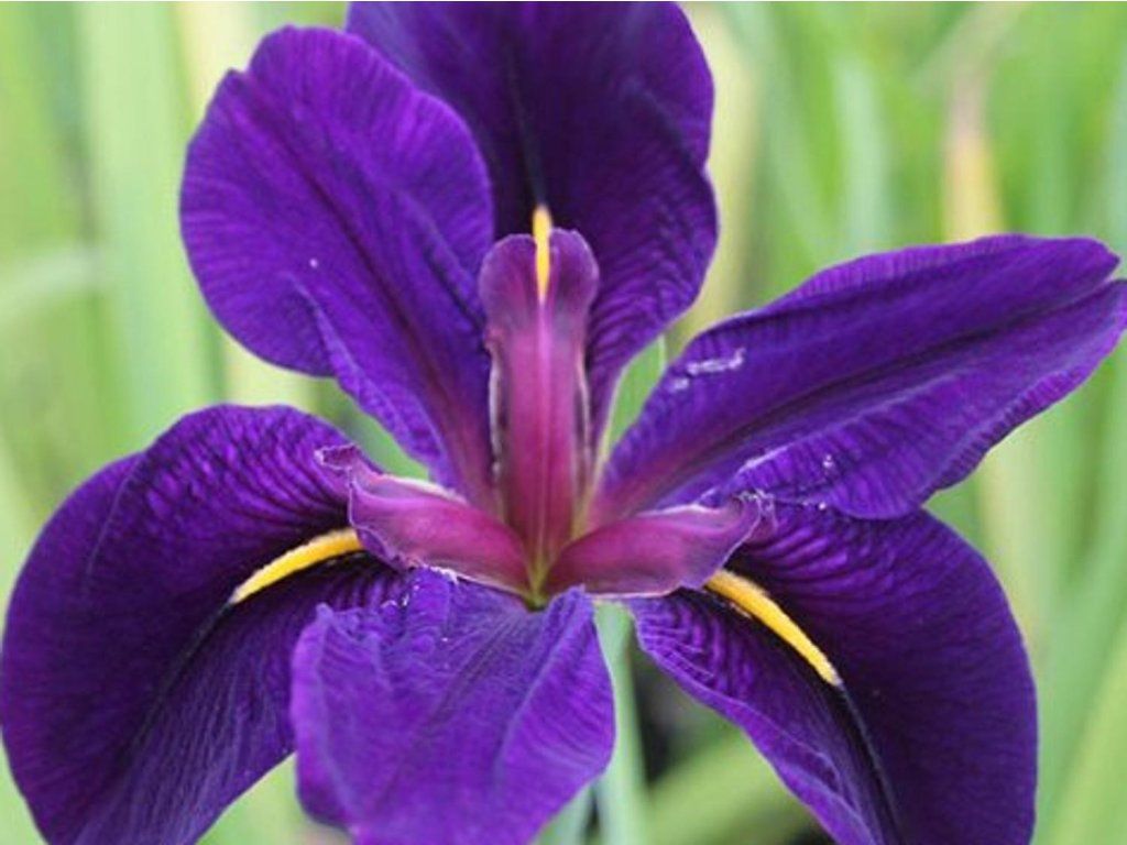 Schwertlilie „Black Gamecock“ - eine der bekanntesten Sorten dieser Schwertlilienart. Sie ist bekannt für ihre dunkelvioletten bis fast schwarzen Blüten, die ein markantes und elegantes Aussehen haben. Diese Irisart stammt ursprünglich aus Feuchtgebieten im südlichen Teil der Vereinigten Staaten und ist beliebt für ihre Schönheit und Widerstandsfähigkeit in nassen oder feuchten Gärten. Seine Blüten sind groß, dunkel und haben auf den unteren Blütenblättern eine ausgeprägte gelbe oder orangefarbene Maserung, die einen Kontrast zu ihrem dunklen Hintergrund bildet. Die Blüten blühen normalerweise im späten Frühling bis Frühsommer und sorgen für eine auffällige Farbenshow auf der Pflanze. Diese Sorte erreicht eine Höhe von etwa 60–90 cm und hat einen festen, aufrechten Wuchs. Die Blätter sind schmal, graugrün, was die Pflanze auch außerhalb der Blütezeit attraktiv macht. Geeignet für Teiche oder feuchtere Standorte.