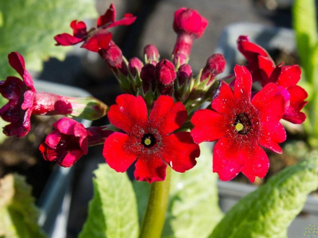 Primula japonica 'Miller's Crimson' - eine horstbildende Staude aus feuchteren Bergwäldern und Bachufern Ostasiens, in der Kultur bekannt als „Japanische Primel“ und gehört zu den stockwerkartigen, sogenannten Candelabra-Primeln. Die Sorte 'Miller's Crimson' zeichnet sich durch ihre tief karminrote Färbung und die typische Anordnung der Blüten in Quirlen aus, oft in 4–6 Stockwerken übereinander. Zur Blütezeit erreicht sie normalerweise eine Höhe von 40–60 cm, die Blattrosette ist etwa 15–20 cm groß und der Horst verbreitert sich allmählich auf 30–45 cm. Die Blätter sind grün, runzlig und weich ledrig, ziehen nach der Saison meist ein und treiben im Frühjahr zuverlässig neu aus. Die Blüten öffnen sich allmählich je nach Temperatur von Mai bis Juni, manchmal bis Juli. Sie sind trichterförmig mit einem helleren Auge und werden an feuchten Standorten von frühen Bestäubern besucht. Die Pflanze eignet sich für Gruppen am Teich, in halbschattigen Gartenbereichen, im Regenbeet und auch in größeren Schalen, wo der etagenförmige Blütenstand über den Rand hinausragt. In der Komposition bewährt sich die Nachbarschaft von Farnen, Funkien, Vergissmeinnicht, Purpurglöckchen, anderen Primeln in feineren Tönen und Frühlingszwiebelblumen.