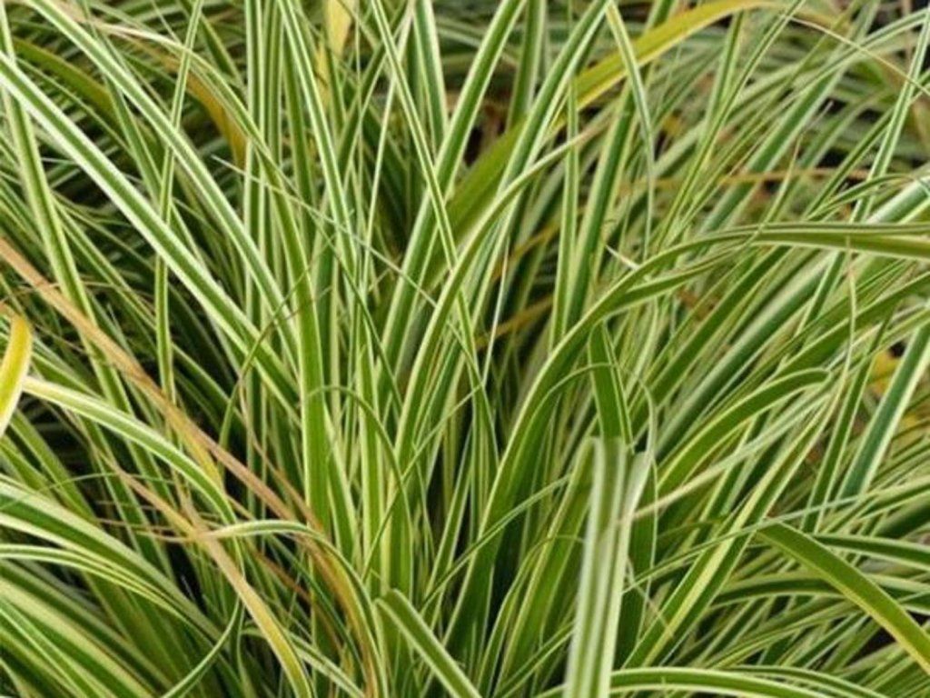 Japanische Segge 'Evercream' - auffälliges Gras mit schmalen, gewölbten, tiefgrünen Blättern, die gelb gesäumt sind. Wächst auf eine Höhe und Breite von 0,3-0,6 m. Das Wachstum ist sehr kompakt, weshalb die Pflanze auch für die Topfkultur geeignet ist.