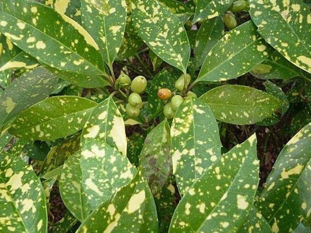 Japanische Aukube - ein immergrüner Strauch aus der Familie der Garryaceae, der aus den feuchten Wäldern und Gebüschen Ostasiens, insbesondere Japans, Koreas und Chinas stammt. Er bildet eine dichte, breit buschige Wuchsform mit ledrigen, glänzenden Blättern, die auch im tieferen Schatten gut Licht reflektieren. Die Blätter sind 8–20 cm lang, elliptisch, mit einem fein gesägten Rand, bei einigen Gartenformen tritt eine gelbe Sprenkelung auf. Von März bis April erscheinen an den Triebspitzen kleine, purpurfarbene Blüten. Die Art ist meist zweihäusig, daher bilden sich rote Beeren an weiblichen Pflanzen nach der Bestäubung durch ein nahes männliches Exemplar. Die Früchte bleiben oft bis in den Winter erhalten. Das Wachstum ist langsam bis mittel, normalerweise 10–25 cm pro Jahr. Für Kompositionen passt sie zu Mahonien, Spindelsträuchern, Rhododendren, Farnen und Funkien, in der städtischen Begrünung zeichnet sie sich auch durch ihre Toleranz gegenüber verschmutzter Luft aus. Für eine sichere Fruchtbildung wird die Pflanzung einer weiblichen und einer männlichen Pflanze in Reichweite von Insekten gewählt, andernfalls bleibt der Strauch hauptsächlich wegen seines Laubes dekorativ.