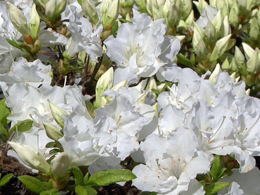 Japanische Azalee 'Feenkiessen' - eine Kultivarsorte der Japanischen Azalee, die bis zu 80 cm hoch und fast genauso breit wird. Sie zeichnet sich durch volle und schneeweiße Blüten aus, die je nach Wetterentwicklung im April und Mai an der Pflanze zu erscheinen beginnen. Die halbimmergrünen Blätter sind oval, dunkelgrün und klein. Wenn der Winter streng ist, fallen sie ab. Japanische Azaleen eignen sich für die Gruppenpflanzung und sehen auch in Kübeln gut aus.