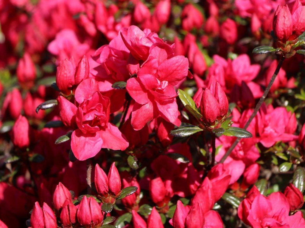 Sie gehört zur selben Gruppe wie Rhododendren. Im Gegensatz zu ihnen sind Azaleen kleiner (obwohl es auch größere Exemplare gibt) und einige Kultivare werfen im Herbst teilweise oder ganz ihr Laub ab. Während Rhododendren eher glockenförmige Blüten haben, ähneln die Blüten von Azaleen in ihrer Form einem Trichter. Für diejenigen, die nicht viel Platz haben, sind japanische Azaleen, die eher in die Breite als in die Höhe wachsen, absolut ideal. Die meisten Azaleen bevorzugen Teilsonne oder Halbschatten, da direkte Sonne zu Sonnenbrand führen kann und zu wenig Licht zu Vergeilung der Triebe und Blüten führt. Sie blühen von Mai bis Juni. Verblühte Blüten vorsichtig ausbrechen, damit der Strauch nicht weiter ausgelaugt wird.
