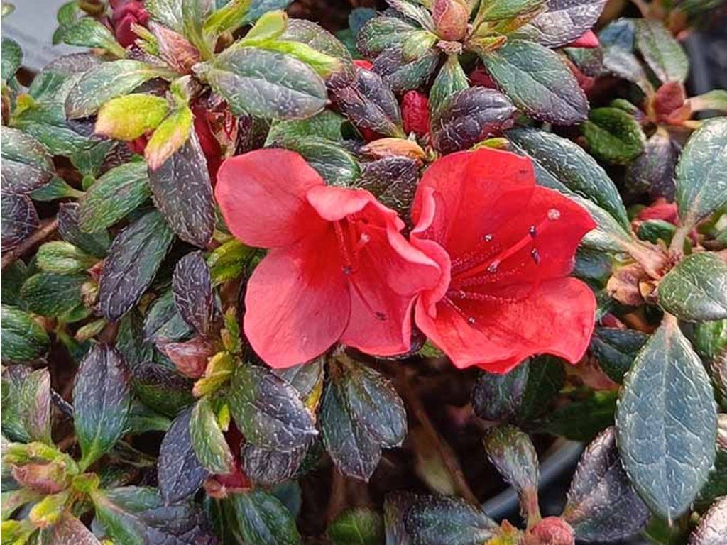 Japanische Azalee 'Sandy's Fire' - ein Kultivar der Japanischen Azalee, gezüchtet für auffällige rote Blüten und ein höheres Wachstum, das den Bedürfnissen der Gartengestaltung entspricht. Ihre genetische Grundlage basiert auf Hybriden der Gruppen Kurume und Satsuki, die für ihre dichte Verzweigung, ihren kompakten Habitus und ihre höhere Frostbeständigkeit geschätzt werden, was sie für das mitteleuropäische Klima gut geeignet macht. Der Strauch erreicht eine Höhe und Breite von 50-80 cm und bildet eine feste, gleichmäßig dichte Krone, die auch außerhalb der Blütezeit dekorativ wirkt. Die Blätter sind klein, ledrig, elliptisch, tiefgrün und bleiben in der Regel das ganze Jahr über an der Pflanze. Im Mai erscheinen tiefrote, trichterförmige Blüten von weit geöffneter Form, die sich in üppigeren Gruppen an den Triebspitzen sammeln. Ihre intensive Farbe kommt in Heidekrautkompositionen, japanischen Gärten und in Kombinationen mit dunkelblättrigen oder gelbgrünen Sträuchern gut zur Geltung. In Behältern wird sie als markanter Frühlingsakzent eingesetzt und trägt dank ihres immergrünen Laubes auch im Winter zur Struktur der Bepflanzung bei. Die Sorte eignet sich als Unterpflanzung für höhere Rhododendren, als Ergänzung zu Pieris, Steingartenfarnen oder niedrigen Gehölzen, wo sie für kontrastierende Farben und eine stabile Form sorgt.