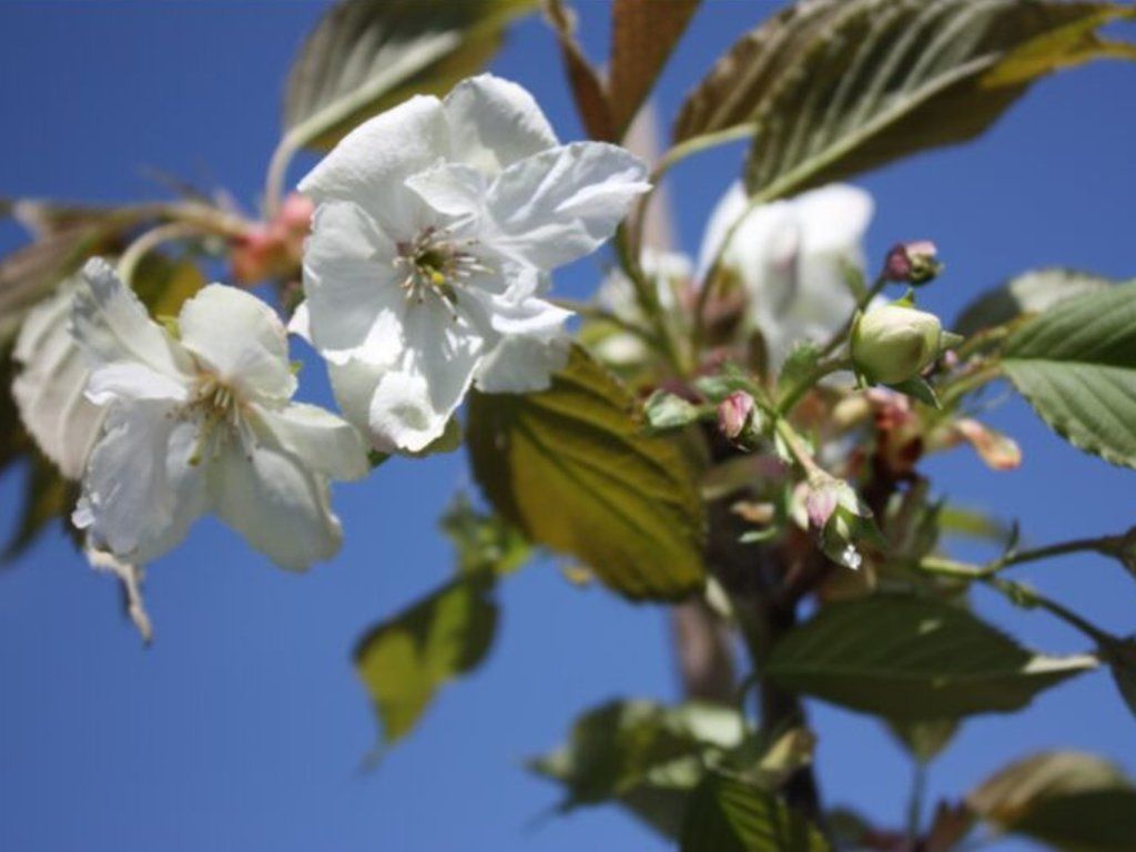 Zierkirsche stammt ursprünglich aus Japan und China, aus Regionen, in denen sie zusammen mit Chrysanthemen und Pfingstrosen ein Symbol für erhabenes orientalisches Kulturerbe ist. Sie gehört zu den hochgeschätzten blühenden Bäumen, insbesondere diejenigen mit gefüllten Blüten, die seit dem 19. Jahrhundert in Europa angebaut werden. Ihre charakteristischen Äste sind schräg angeordnet und bilden eine ungleichmäßig halbkugelförmige Krone, die Sträuchern bis zu kleineren Bäumen eine Höhe von 3-8 m verleiht. Die Rinde ist glatt, dunkelbraun und schält sich quer ab. Die Blätter dieses Gehölzes sind glatt, glänzend, spitz und bilden 6-15 cm lange Blättchen mit einer graugrünen Unterseite, die einen Kontrast zur bräunlich-grünen Oberseite bildet. Weiße bis rosafarbene Zierkirschblüten erscheinen in Gruppen von 3-5 und haben einen Durchmesser von etwa 3-4 cm. Die Blüten bilden traubenförmige Blütenstände und haben Stiele von bis zu 40 mm Länge. Sie blühen von April bis Mai, was diesem Gehölz ein sehr attraktives Aussehen verleiht. Zierkirschen zeichnen sich durch ein breites Spektrum an Kultivaren aus, was zu ihrer ästhetischen Vielfalt und ihrem bewundernswerten Aussehen beiträgt. Dieser Baum wächst gut auf trockeneren Böden, daher wird empfohlen, Standorte in höher gelegenen Lagen mit guter Drainage, eher lehmigen Böden zu wählen. Es ist ratsam, dass der Standort sonnig und warm ist. Sie wurzelt sehr flach, normalerweise etwa 1,5 m vom Erdboden entfernt.