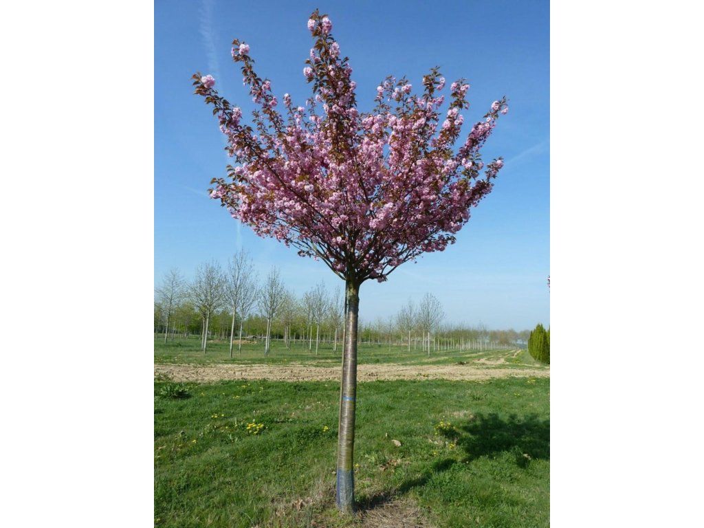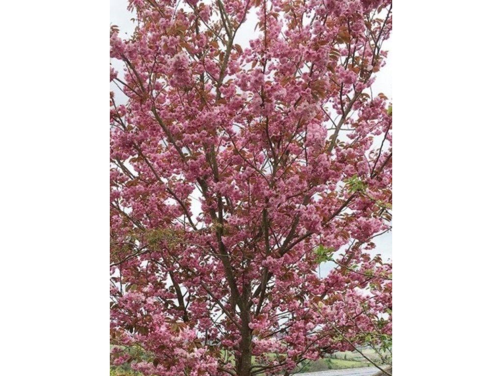 Zierkirsche 'Kanzan' – gehört zu den bekanntesten und beliebtesten Zierkirschen überhaupt. Sie wird für ihre außergewöhnlich reichen, gefüllten rosa Blüten, ihren eleganten Habitus und ihre zuverlässige Blüte geschätzt. Sie ist eine typische „Straßenkirsche“, die man in Parks und Alleen auf der ganzen Welt sehen kann. Sie wächst als mittelgroßer Baum, normalerweise 6 bis 10 Meter hoch, mit einer breit vasenförmigen Krone, die sich mit dem Alter erweitert. Der Baum wächst mittelschnell und wirkt auch außerhalb der Blütezeit sehr dekorativ. Die Blätter treiben bronzefarben aus, sind im Sommer dunkelgrün und färben sich im Herbst gelb, orange bis rot. Die Blüten erscheinen in der zweiten Aprilhälfte bis Anfang Mai. Sie sind gefüllt, dicht geschichtet, tiefrosa, mit einem Durchmesser von etwa 5 cm, in Büscheln zu 2–5 angeordnet. Zur Blütezeit ist der Baum so mit Blüten bedeckt, dass man die Blätter kaum sieht. Die Blüten duften zart. Sie ist frostbeständig und widerstandsfähig gegen Krankheiten und Luftverschmutzung. Ein Rückschnitt ist normalerweise nicht notwendig, er wird nur nach der Blüte zur Formgebung oder zur Gesunderhaltung durchgeführt. Sie ist ideal als Solitärpflanze, für Alleen, an Zufahrtsstraßen, in Parks und größeren Gärten. Dank ihrer Blütenfülle und eleganten Form wird sie zu einem dominierenden Element jeder Pflanzung.