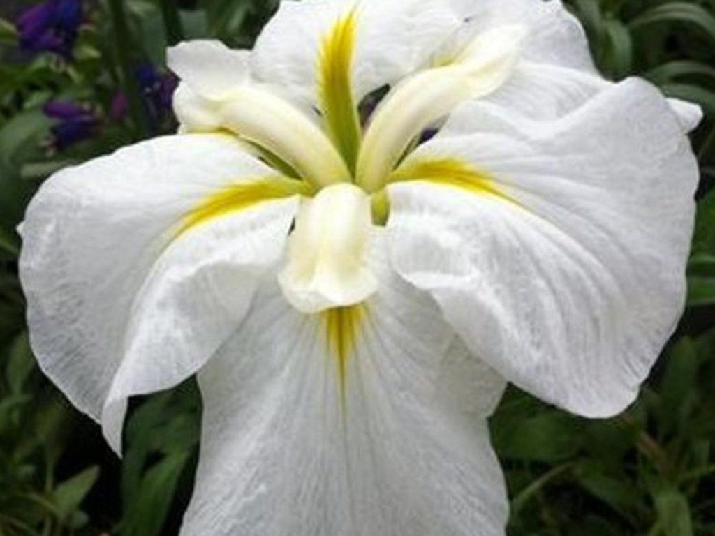 Japanische Schwertlilie 'Gold Bound' - eine rein weiße Sorte mit einer großen, bei voller Blüte fast flachen Blüte. Aus der Mitte der Blüte strahlen gelbe Strahlen. Die Blüte selbst kann einen Durchmesser von bis zu 20 cm haben. Die Pflanze erreicht eine Höhe von 60-90 cm. Sie blüht von Juni bis August. Diese Irisart bevorzugt im Gegensatz zu anderen feuchtere bis nasse Standorte und eignet sich daher auch für die Pflanzung an den Ufern von Teichen oder kleinen Seen.