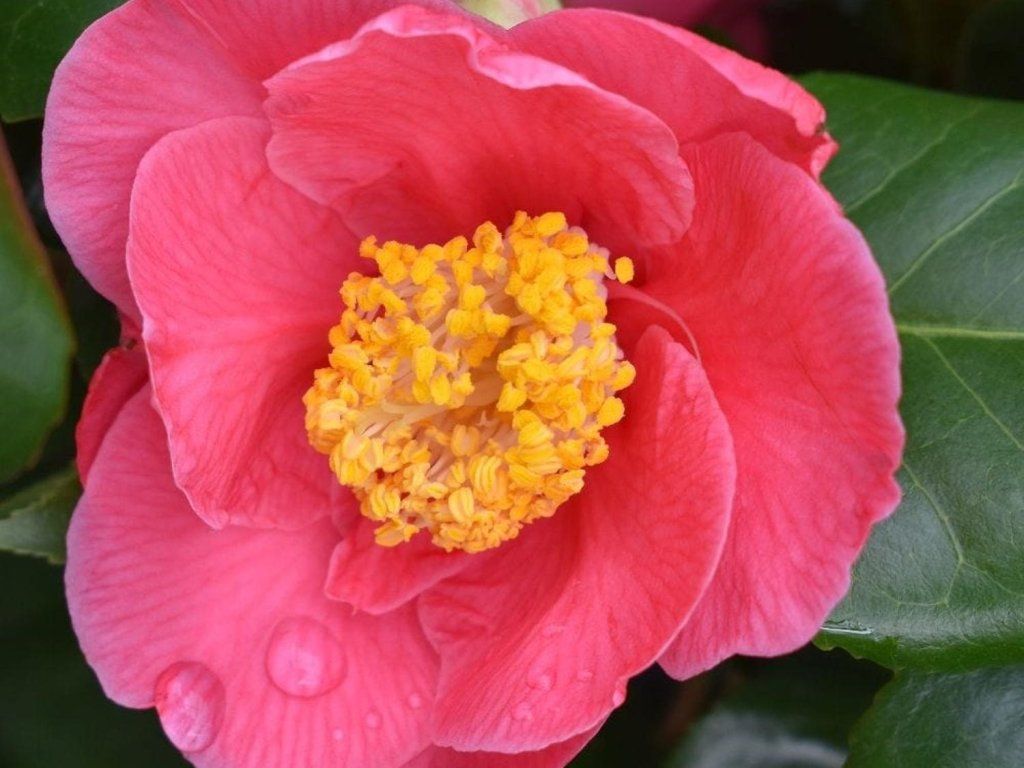 Japanische Kamelie 'Dr. King' - Camellia japonica stammt aus den Wäldern Japans, Koreas und Südostchinas, wo sie im Halbschatten, in Umgebungen mit höherer Luftfeuchtigkeit und in sauren, humusreichen Böden wächst. Die Sorte 'Dr. "King" gehört zu den klassischen europäischen Gartenauswahlen, die bereits in der ersten Hälfte des 20. Jahrhunderts in Sammlungen verbreitet waren. Der Strauch hat einen aufrechten bis leicht ausladenden Habitus, wächst langsam bis mittelschnell und erreicht im Erwachsenenalter eine Höhe von etwa 2-3 m und eine Breite von 1,5-2 m, bei langfristiger Kultivierung im Kübel bleibt er normalerweise kleiner. Die Blätter sind immergrün, elliptisch, ledrig, dunkelgrün und glänzend. Die Blüten sind groß, voll, schalenförmig, mit einem Durchmesser von 10-12 cm, mit dicht angeordneten Blütenblättern in einem rotrosafarbenen Farbton, der je nach Temperatur während der Blüte leicht variieren kann. Die Blütezeit erstreckt sich von Februar bis April. Die Sorte wird als Solitärpflanze in Töpfen, in Wintergärten und an repräsentativen Eingängen eingesetzt, wo der feine Farbton der Blüten zur Geltung kommt. Im frühen Frühling ist die Pflanze leicht bienenfreundlich - sie zieht bestäubende Insekten an.