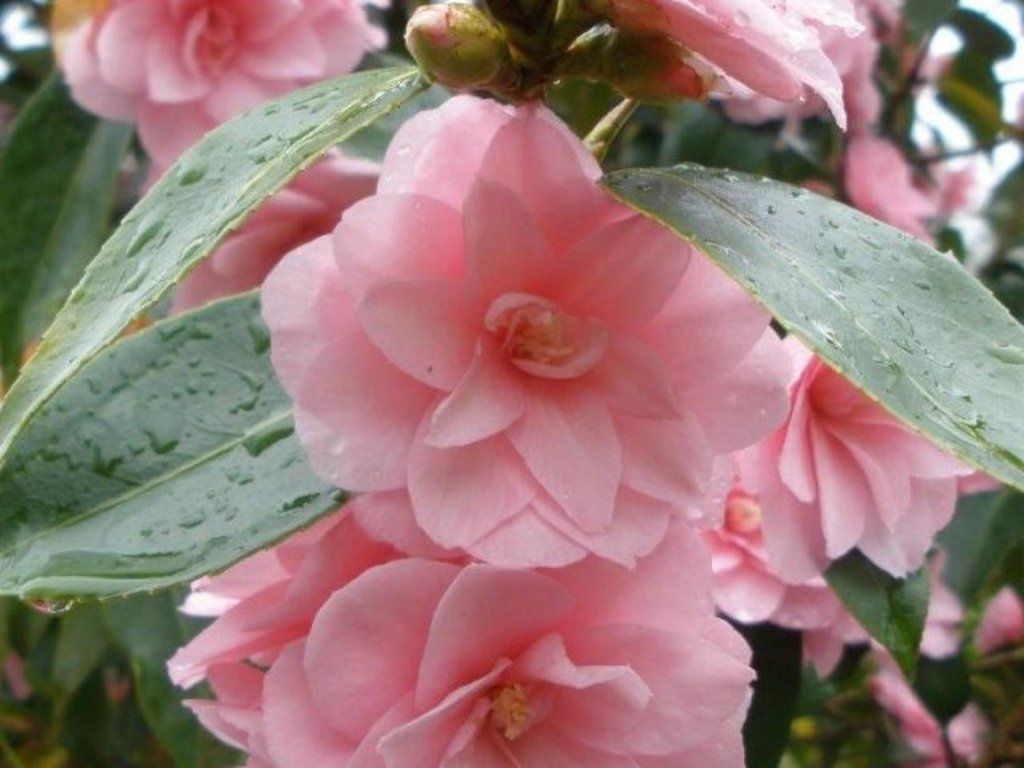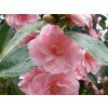 Japanische Kamelie 'Spring Festival' - gehört zu den immergrünen Kamelien aus der Familie der Teestrauchgewächse. In europäischen Katalogen wird sie auch als „cuspidata hybrid“ bezeichnet, also eine Auswahl aus dem Kreis der feiner belaubten, widerstandsfähigeren Hybriden. Sie wächst langsam bis mittelstark und bildet einen dichten, kompakten Strauch von etwa 1,2–2,0 m Höhe und 0,8–1,5 m Breite mit ledrigen, glänzenden, schmaleren Blättern. Nach der Blüte treibt sie oft bronzefarbenes bis kupferfarbenes junges Laub aus, das allmählich dunkler wird. Die Blüte beginnt je nach Winterverlauf ab Ende Februar, unter den Bedingungen der Tschechischen Republik am häufigsten im März und dauert bis Mai. Die Blüten sind kleiner, gefüllt, rosa, normalerweise 4–6 cm groß, mit gelben Staubgefäßen, die bei voller Öffnung sichtbar sind. Die Blüten öffnen sich allmählich, sodass ein Strauch mehrere Wochen blühen kann und wie eine zartrosa Laterne zwischen dem dunklen Laub wirkt. Im Gegensatz zu großblütigen japanischen Kamelien wirkt dieser Kultivar luftiger und kommt auch in kleineren Gärten besser zur Geltung, wo kein Platz für breite, kräftige Sträucher ist. Sie eignet sich als Solitär im Heidegarten, im Unterwuchs höherer Sträucher oder am Eingang in einem Kübel, wo die immergrünen Blätter auch im Winter Struktur behalten. Zartrosa Blüten harmonieren gut mit Pieris, Rhododendren, Skimmien und Frühlingszwiebelblumen in Weiß und Blau.