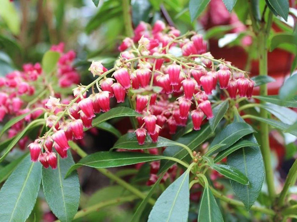 Japanische Pieris 'Valley Valentine' - immergrüner, langsam wachsender Strauch. Er erreicht eine Höhe und Breite von 1,5 m, abhängig von den Kulturbedingungen. Die Blätter sind abgerundet, eiförmig, anfangs orange-rot gefärbt, später dunkelgrün gefärbt. Sie sind 5 - 7 cm lang. Im April blüht die Pflanze mit gefüllten, glockenförmigen Blüten, die in hängenden Trauben angeordnet sind und frischrosa Töne tragen. Hängende Büschel voller glockenförmiger, rosafarbener Blüten blühen. Die Knospen bilden sich im Spätsommer an Trieben aus dem Vorjahr. Eine ideale Pflanze auch für halbschattige und Heidekrautstandorte.