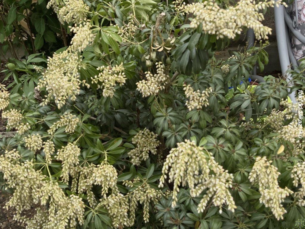 Japanische Pieris - ein kompakt wachsender, immergrüner Strauch, der je nach Kulturbedingungen eine Höhe von ca. 0,8-1,5 m erreicht. Blüht von Mitte März bis Ende April. Die Blütenrispen sind cremeweiß gefärbt und blühen in großer Zahl. Die Blätter sind lanzettlich, dunkelgrün und glänzend. Sieht in einem Topf oder in Gesellschaft von Stauden sehr schön aus und kommt auch als Solitärpflanze gut zur Geltung.