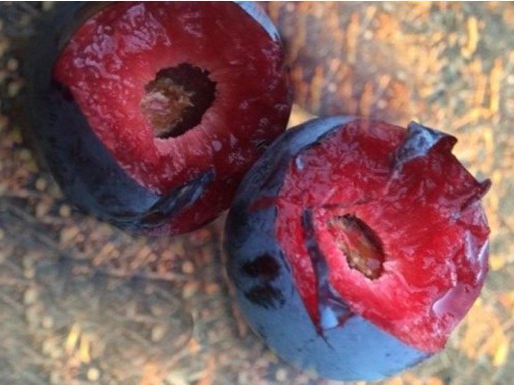 Japanische Pflaume 'Bold Leon' - widerstandsfähige Sorte mit großen, ovalen Früchten. Die Schale ist dunkel, violett-blau bis fast schwarz. Das Fruchtfleisch ist rot, saftig und süß. Die Früchte sind fest, sehr gut zu handhaben. Sie reifen ab der zweiten Augusthälfte.