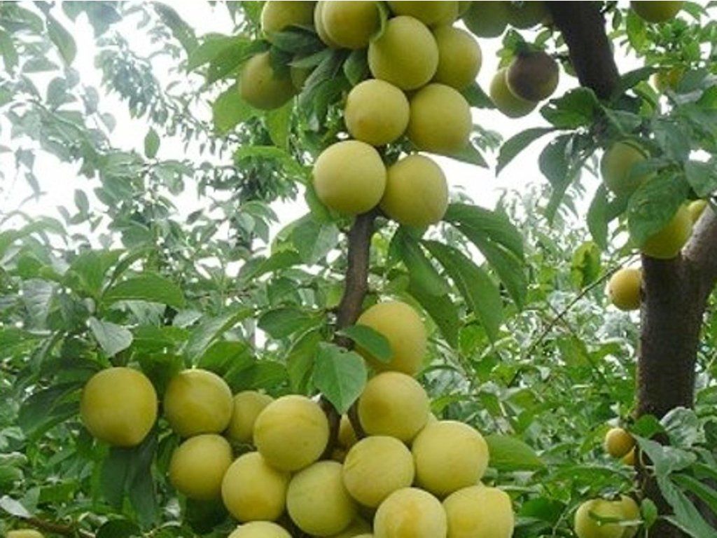 Japanische Pflaume 'Shiro' - beliebte Sorte aus den USA. Sie wächst sehr stark. Sie ist fremdbefruchtend, geeignete Bestäuber sind Santa Rosa, Satsuma und Myrobalanen. Die Frucht ist herzförmig, die Schale ist dünn und leuchtend gelb. Das Fruchtfleisch ist gelb, mittelfest, sehr aromatisch und saftig. Die Ernte reifer Früchte kann Ende Juli erfolgen. Sie trägt reichlich Früchte, daher wird das Ausdünnen der Früchte empfohlen.