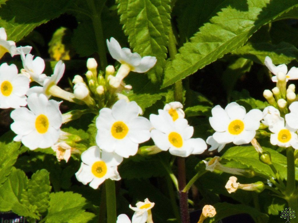 Japanische Primel 'Alba' - diese Staude kann je nach Kulturbedingungen etwa 40 - 50 cm hoch werden. Die Blätter sind bis zu 35 cm lang, dünn, hellgrün, länglich-eiförmig und in der Mitte bis zu 15 cm breit. Der Blütenstand erscheint im Juni und Juli. Die Blüten bestehen meist aus 5 zarten Blütenblättern, die schneeweiß gefärbt sind. In der Mitte der Blüte befindet sich ein tiefgelber Kern. Sie eignet sich hervorragend für das Staudenbeet, den Kübel oder als Solitärpflanze für Gärten. Sie ist pflegeleicht und voll frosthart. Sie kommt neben Rhododendren oder anderen feuchtigkeitsliebenden Primeln wunderschön zur Geltung.