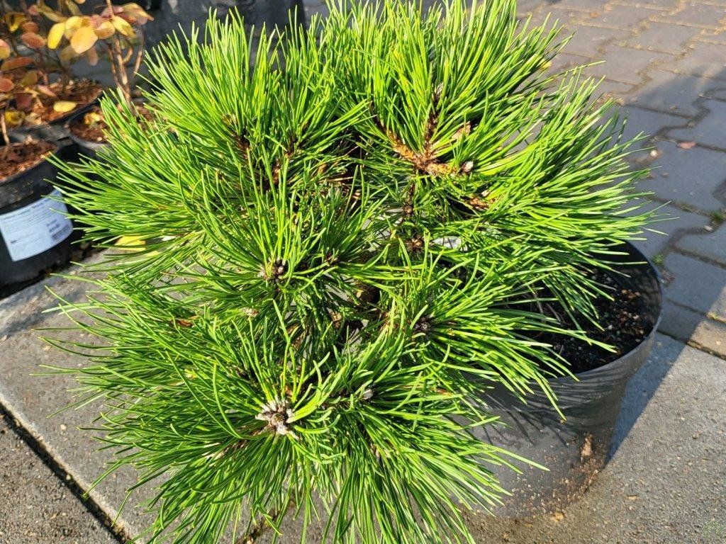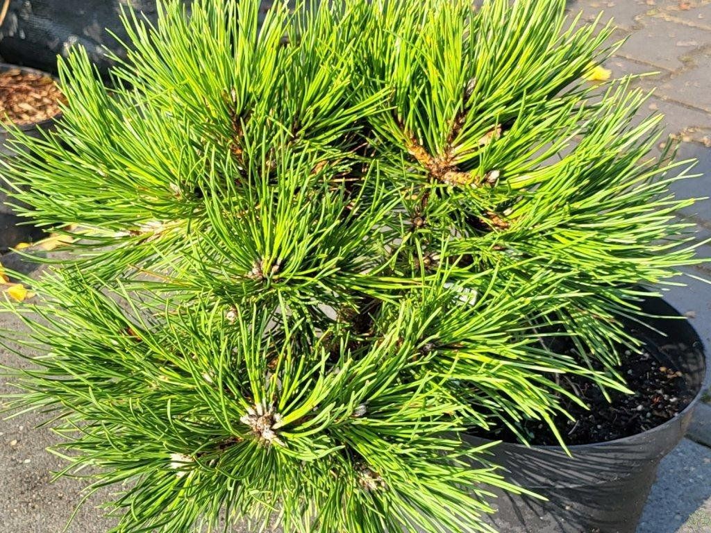 Japanische Rotkiefer 'Bambino' - langsam wachsender Kultivar, der nur 1,4 m hoch wird. Der Habitus ist kompakt. Etwa im Alter von 10 Jahren erreicht sie eine Höhe von 45 cm und eine Breite von 60 cm. Wenn die Pflanze auf einem Stamm veredelt ist, richtet sich die Höhe nach der Veredelungsstelle. Das Gesamtwachstum ist langsam, es bildet luftige und dichte Polster, die jährlichen Zuwächse liegen bei etwa 7 cm. Die Winterknospen haben eine rotbraune Farbe. Die Nadeln leuchten in einem mittleren Grün und wachsen in Büscheln zu zweit, sie sind etwa 5 cm lang. Wir wählen einen sonnigen Standort mit gut durchlässigem Boden. Sie eignet sich hervorragend für Vorgärten, größere Behälter, Atrien und Steingärten. Sie ist vollständig frostbeständig.