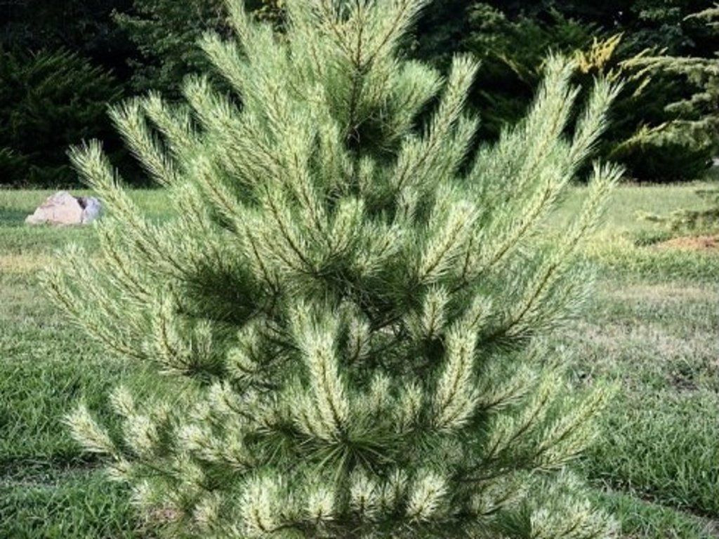 Japanische Rotkiefer 'Burker´s Red Variegata' - mittelhoher Wuchs mit konischer Form. Im Alter von 10 Jahren erreicht sie eine Höhe von 2 m und eine Breite von 1,5 m. Die Nadeln sind gelbgrün mit einem hellgelb-weißen Streifen. Im Winter können sich einige Nadeln rot oder rotbraun färben, meist anstelle des gelb-weißen Streifens. Das Nadelwerk ist lang und farblich auffällig, daher kann dieser Baum leicht zum Solitär in Ihrem Garten werden.