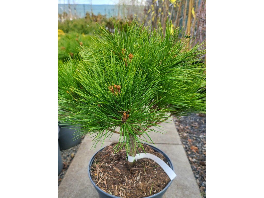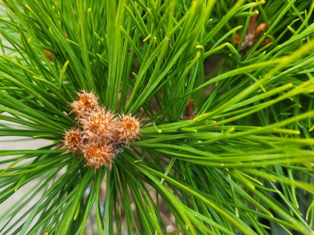 Feldkiefer - Pinus densiflora ist ein majestätischer Baum, dessen Ursprung auf weite Gebiete Asiens zurückgeführt werden kann. Er kommt natürlicherweise in China, Japan und Korea vor, wo er oft Teil von Bergökosystemen ist. Die Japanische Rotkiefer wächst gerne in vielfältigen, trockenen, sandigen oder steinigen bis torfigen, sauren Böden. Dank seiner ausgeprägten Frostbeständigkeit, die bis zu Temperaturen von -28 °C reicht, kann er rauen Winterbedingungen widerstehen. Optimale Wachstumsbedingungen für Pinus densiflora umfassen direkte Sonneneinstrahlung, was ihr gesundes Wachstum und ihre Entwicklung fördert. Er zeichnet sich durch eine hohe Regenerationsfähigkeit aus. Die Japanische Rotkiefer ist ein immergrüner Nadelbaum, der sich durch sein stattliches Wachstum auszeichnet und eine Höhe von bis zu 30 m erreichen kann. Der Stamm dieses Baumes ist oft vom Wind verdreht. Die Äste breiten sich horizontal aus und sind anfangs grau-grün mit glatter Oberfläche, nehmen aber mit der Zeit einen orange-roten Farbton an und werden von schuppiger Rinde bedeckt. Die Krone der Japanischen Rotkiefer hat eine unregelmäßige oder schirmförmige Gestalt. Die Rinde des Baumes präsentiert sich jung in einem rot-orange-braunen Farbton und neigt zum Abblättern. Die Nadeln sind biegsam, dunkelgrün gefärbt und zu zweit in Büscheln angeordnet. Sie erreichen eine Länge von 8–12 cm. Männliche Zapfen entwickeln sich an den Enden der Triebe, sind klein, eiförmig, haben eine gelb-braune Farbe und erreichen eine Länge von etwa 80 mm. Weibliche Zapfen, also Kiefernzapfen, haben eine kegelförmig-eiförmige Gestalt und eine Größe von 4-7 cm. Diese Kiefernzapfen sind an einem 1–3 mm langen, leicht biegsamen Stiel befestigt und zeichnen sich durch eine goldbraune Farbe aus. Sie treten häufig in Gruppen auf und können am Baum mehrere Jahre geschlossen bleiben. Die männlichen und weiblichen Zapfen sind charakteristische und typische Merkmale dieser schönen Pflanze.