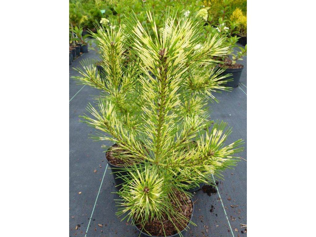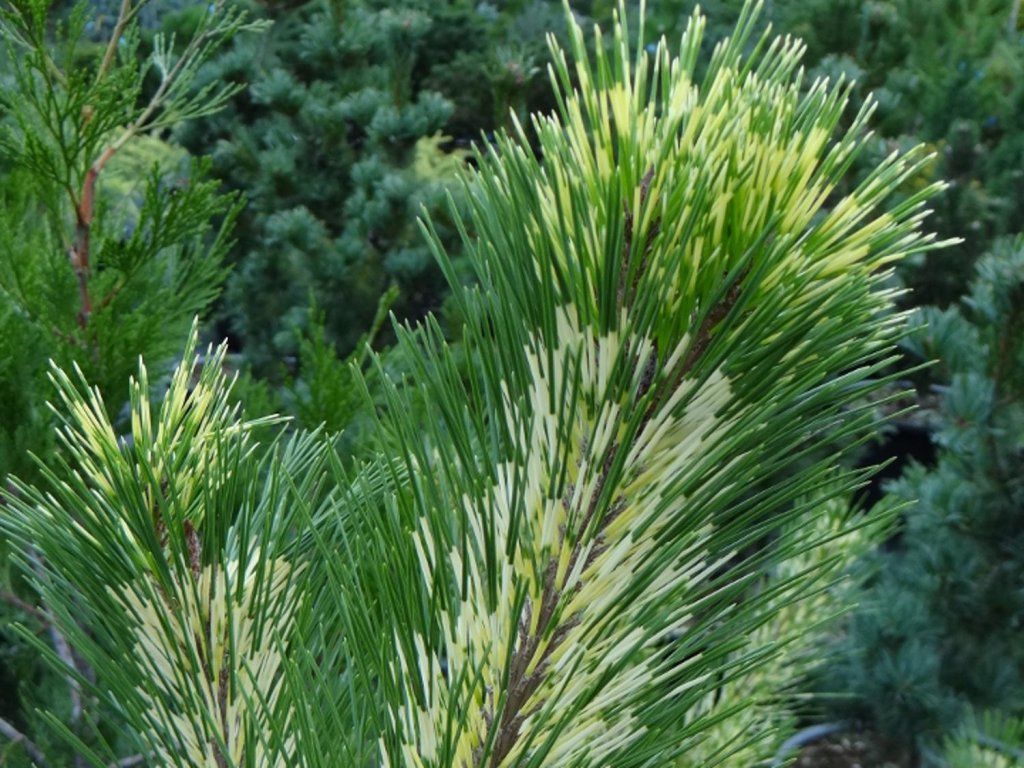 Fächerkiefer 'Shiro-nishiki' - gehört zu den panaschierten Auslesen aus Ostasien, die als immergrüner Akzent in Gärten und in geformten Kompositionen wie Niwaki eingesetzt werden. Der Habitus ist in der Regel schmaler und aufrechter, mit einer unregelmäßig kegelförmigen Krone. Nach 10 Jahren liegt sie oft bei etwa 1 m, im Erwachsenenalter erreicht sie normalerweise eine Höhe von 2–3 m und eine Breite von 1–1,5 m. Die Nadeln wachsen in Büscheln zu zweit, sind 8–12 cm lang und gestreift in Grün-, Creme- bis Gelbtönen. In der kälteren Jahreszeit verstärkt sich der Streifenkontrast und die Pflanze behält auch im Winter ihre Zierde. Die Rinde älterer Pflanzen nimmt allmählich orange-rote Farbtöne an und eiförmige Zapfen von etwa 4–7 cm Länge fügen ein feines Detail hinzu. Die Art besiedelt natürlicherweise sonnige Hänge und lichte Wälder Japans, Koreas und Nordostchinas, oft auf mineralischen, sandigen bis steinigen Böden. In der Komposition sticht sie neben dunkelgrünen Nadelbäumen, Ziergräsern und Steinen hervor, wo die Zeichnung der Nadeln gut zur Geltung kommt. Wenn Sie einen ungewöhnlichen immergrünen Nadelbaum suchen, der auf den ersten Blick besticht, dann ist die Kiefer 'Shiro-nishiki' die beste Wahl. Eine wirklich gelungene Sorte.