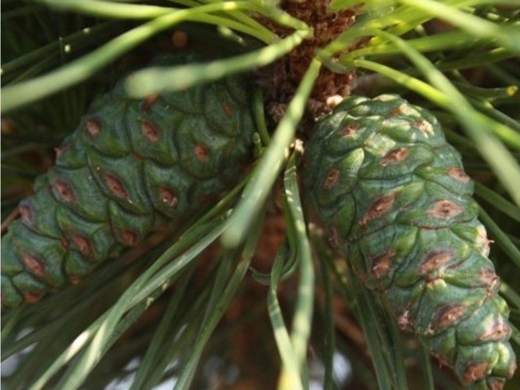 Feldkiefer - Pinus densiflora ist ein majestätischer Baum, dessen Ursprung auf weite Gebiete Asiens zurückgeführt werden kann. Er kommt natürlicherweise in China, Japan und Korea vor, wo er oft Teil von Bergökosystemen ist. Die Japanische Rotkiefer wächst gerne in vielfältigen, trockenen, sandigen oder steinigen bis torfigen, sauren Böden. Dank seiner ausgeprägten Frostbeständigkeit, die bis zu Temperaturen von -28 °C reicht, kann er rauen Winterbedingungen widerstehen. Optimale Wachstumsbedingungen für Pinus densiflora umfassen direkte Sonneneinstrahlung, was ihr gesundes Wachstum und ihre Entwicklung fördert. Er zeichnet sich durch eine hohe Regenerationsfähigkeit aus. Die Japanische Rotkiefer ist ein immergrüner Nadelbaum, der sich durch sein stattliches Wachstum auszeichnet und eine Höhe von bis zu 30 m erreichen kann. Der Stamm dieses Baumes ist oft vom Wind verdreht. Die Äste breiten sich horizontal aus und sind anfangs grau-grün mit glatter Oberfläche, nehmen aber mit der Zeit einen orange-roten Farbton an und werden von schuppiger Rinde bedeckt. Die Krone der Japanischen Rotkiefer hat eine unregelmäßige oder schirmförmige Gestalt. Die Rinde des Baumes präsentiert sich jung in einem rot-orange-braunen Farbton und neigt zum Abblättern. Die Nadeln sind biegsam, dunkelgrün gefärbt und zu zweit in Büscheln angeordnet. Sie erreichen eine Länge von 8–12 cm. Männliche Zapfen entwickeln sich an den Enden der Triebe, sind klein, eiförmig, haben eine gelb-braune Farbe und erreichen eine Länge von etwa 80 mm. Weibliche Zapfen, also Kiefernzapfen, haben eine kegelförmig-eiförmige Gestalt und eine Größe von 4-7 cm. Diese Kiefernzapfen sind an einem 1–3 mm langen, leicht biegsamen Stiel befestigt und zeichnen sich durch eine goldbraune Farbe aus. Sie treten häufig in Gruppen auf und können am Baum mehrere Jahre geschlossen bleiben. Die männlichen und weiblichen Zapfen sind charakteristische und typische Merkmale dieser schönen Pflanze.