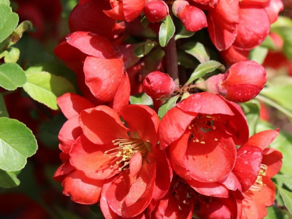 Japanische Zierquitte 'Cido Red' - eine rote und dornenlose Variante der erfolgreichen Sorte der japanischen Zierquitte 'Cido', die aus Litauen stammt. Wie der Name schon sagt, zeichnet sich diese Sorte durch leuchtend rote Blüten mit auffälligen gelben Staubgefäßen in der Mitte aus. Die Blüten, die etwa 4 cm breit werden, öffnen sich im frühen Frühling, normalerweise ab Mitte April. Wenn das Ende des Winters warm ist, können sich die Knospen bereits im März öffnen. Die Blütezeit dauert relativ lange, bis in den Mai hinein, wenn die Sträucher noch voll erblüht sind. Den schönsten Anblick bieten jedoch die kahlen Zweige ohne Blätter, besetzt mit runden roten Knospen, aus denen sich fünfzählige Blüten mit gelblichen Staubgefäßen in der Mitte wie winzige Lotosblumen entfalten. Sie erreicht eine Höhe von ca. 1,5 m bei ähnlicher Breite.