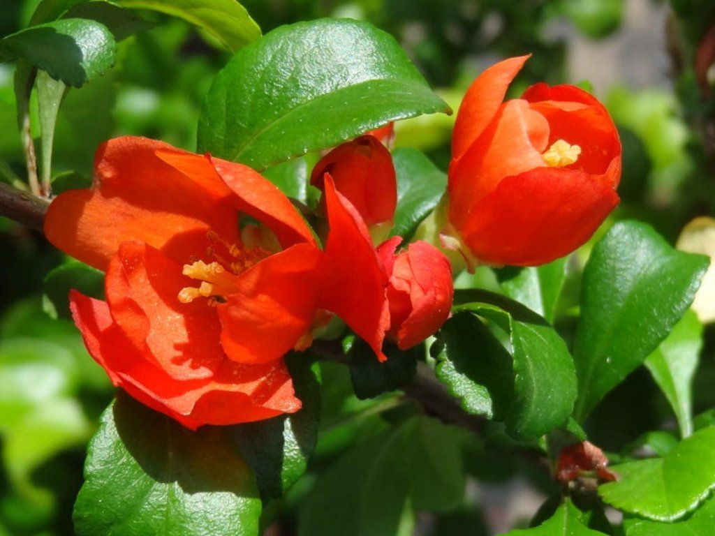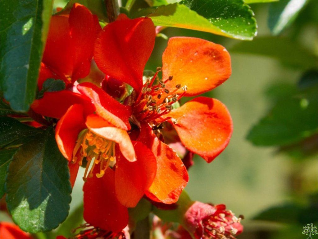 Japanische Scheinquitte 'Sargentii' - ein ausladender Strauch, der eine maximale Höhe von 2 m und eine Breite von 1 - 1,4 m erreicht. Das Wachstum ist langsam, der Strauch ist sehr gut verzweigt. Die Blätter sind klein, zunächst einen leichten Bronzeschimmer aufweisen, später grün werden, sie sind ausgeprägt glänzend. Von März bis April beginnen etwa 2,5 cm große Blüten zu blühen, sie sind schalenförmig, orange und die hervorstehenden Staubgefäße sind cremefarben. Die Blüten werden später durch gelbgrüne bis gelbe Früchte ersetzt, die aromatisch sind. Sie werden häufig zur Herstellung von Marmeladen verwendet.