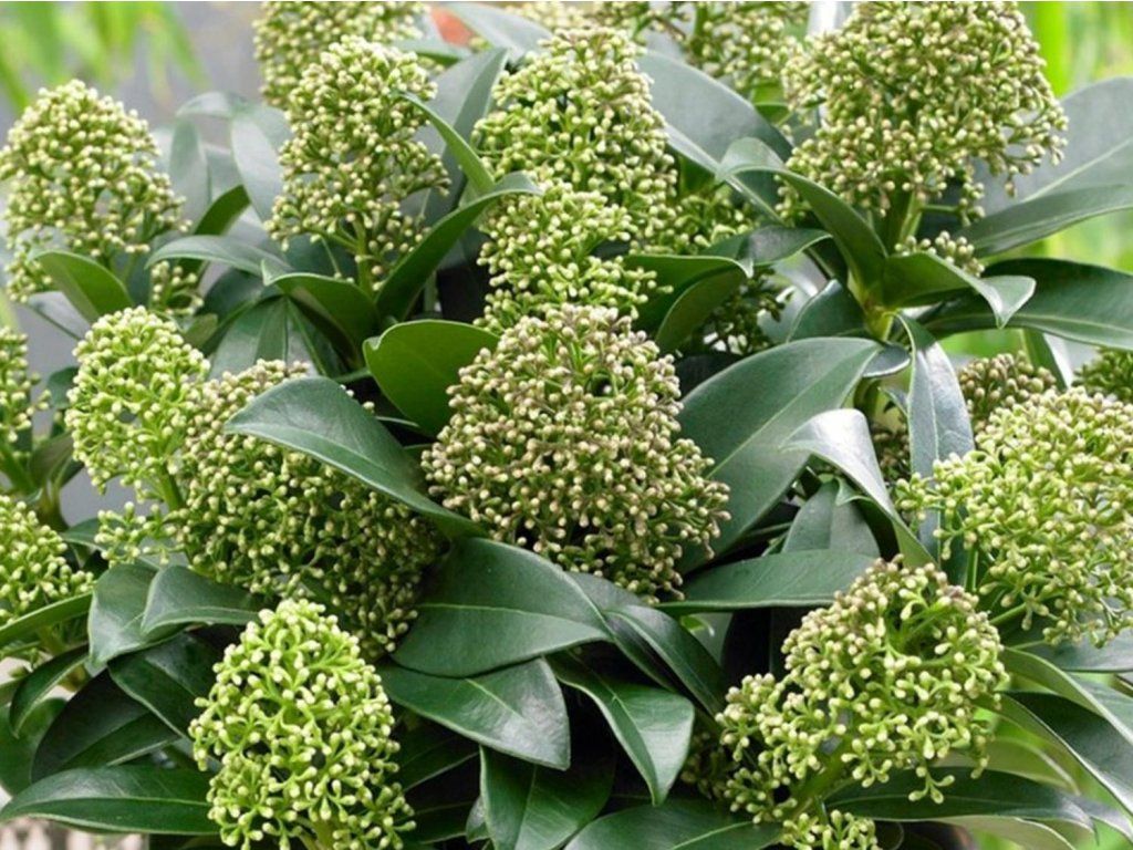Skimmia japonica 'Fragrant Cloud' - kleiner, immergrüner, anspruchsloser, langsam wachsender Strauch, der eine Höhe von 0,3-0,8m und eine Breite von 0,5-1,3m erreicht. Die Blätter sind fest, hochglänzend, in dunkelgrüner Farbe. Im Herbst beginnen sich kleine Knospen zu bilden, aus denen sich im folgenden April cremeweiße, stark duftende Blüten entwickeln. Diese Sorte ist männlich, bildet keine Früchte, ist aber ein geeigneter Bestäuber für weibliche Pflanzen.