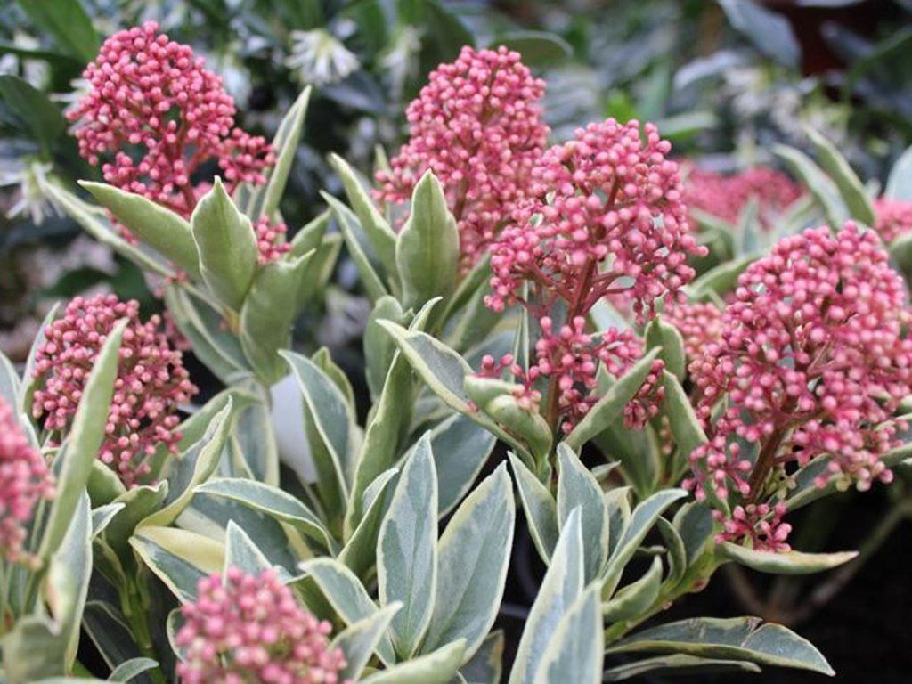 Skimmia japonica 'Magic Marlot' - kompakt wachsender, immergrüner Strauch. Das Wachstum ist sehr langsam. Er erreicht eine Höhe von 50 cm und eine ähnliche Breite. Er hat grüne, eiförmige Blätter mit einem cremefarbenen Rand. Bereits im Herbst beginnen sich weiße Knospen zu bilden, die sich anschließend in weinrote Farbtöne verfärben, aus denen im März bis April cremeweiße bis rosafarbene Blüten blühen. Diese verströmen einen angenehmen Duft. Dieser wunderschöne Strauch sollte in keinem Garten fehlen.