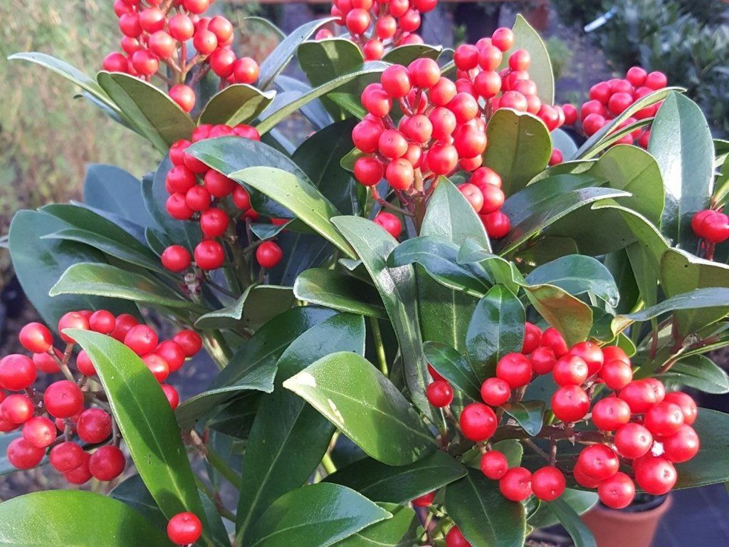 Anbau: Die Skimmie ist ein anspruchsloser Strauch, um den Sie sich kaum kümmern müssen, aber Sie müssen ihn gut platzieren und pflanzen. Sie benötigt ständig feuchten, aber sehr gut durchlässigen Boden, der reich an Nährstoffen ist, insbesondere Eisen und Magnesium. Platzieren Sie sie im Halbschatten oder sogar im tiefen Schatten, z.B. hinter dem Haus, wo die Sonne nicht hinkommt, oder unter dichten Bäumen, die im Sommer Schatten spenden und im Winter ihre dichten Äste das Sonnenlicht streuen. Das Verblassen und Vergilben der Blätter ist ein Zeichen für zu viel Sonne oder Wasser, oder für einen armen, wenig sauren Boden ohne Eisen. Sie verträgt verschmutzte Luft und städtische Umgebungen. Die Pflanze ist giftig. Frosthart bis ca. -27°C.