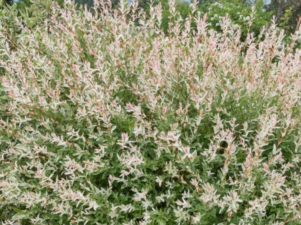 Japanische Weide - die Blätter sind hellgrün mit weißer Marmorierung, an den Spitzen junger Blätter färbt sich diese Marmorierung rosa. Sie blüht früh im Frühling noch vor dem Austreiben der Blätter und die Blüten sind unauffällig, etwa 1,5 cm lange Kätzchen. Sie wächst auf eine Höhe von 2 - 3 m.