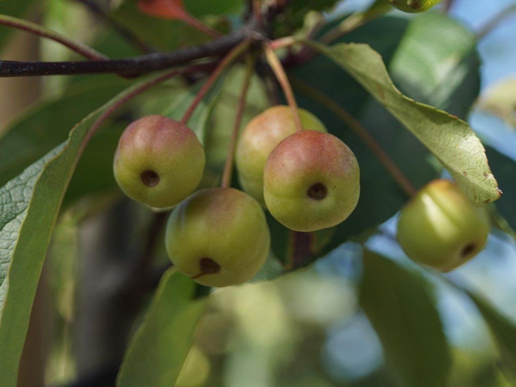 Japanischer Zierapfel - ein kleiner Baum, der bis zu 5 Meter hoch wird mit aufrechten Zweigen. Die Zweige sind schlank, braun, anfangs fein behaart, später kahl. Blüht im April bis Mai mit weißen Blüten mit einem rosa Schimmer. Sie blühen aus purpurnen Knospen. Essbare Früchte reifen im Herbst. Sie sind in Form von kleinen Äpfeln. Sie ist frostbeständig und bietet eine reiche Quelle an Schönheit und Inspiration, nicht nur in Gärten, sondern auch in Parks oder als Unterstützung der Biodiversität für Imker.