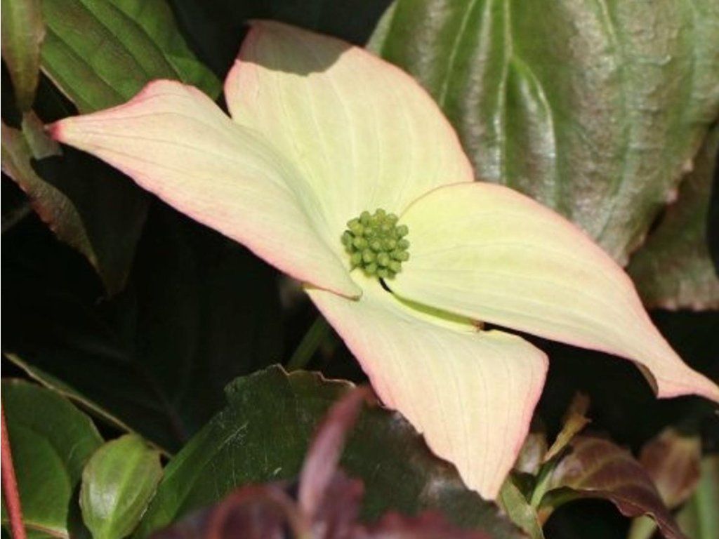 Japanischer Hartriegel 'Ed Mezitt' - gut verzweigter, dichter Strauch, aufrechten, langsameren Wachstums. Wächst auf eine Höhe von 2,5-4m und eine Breite von 2-3,5m. Jährliche Zuwächse betragen 15-40cm. Die Blätter sind oval länglich, die Blattränder sind gewellt. Beim Austreiben sind sie violett, im Laufe der Saison dunkelgrün, im Herbst bronzefarben-orange. Zierbrakteen sind cremeweiß, mit leicht rosafarbenen Rändern. Sie erscheinen um den Mai und Juni.