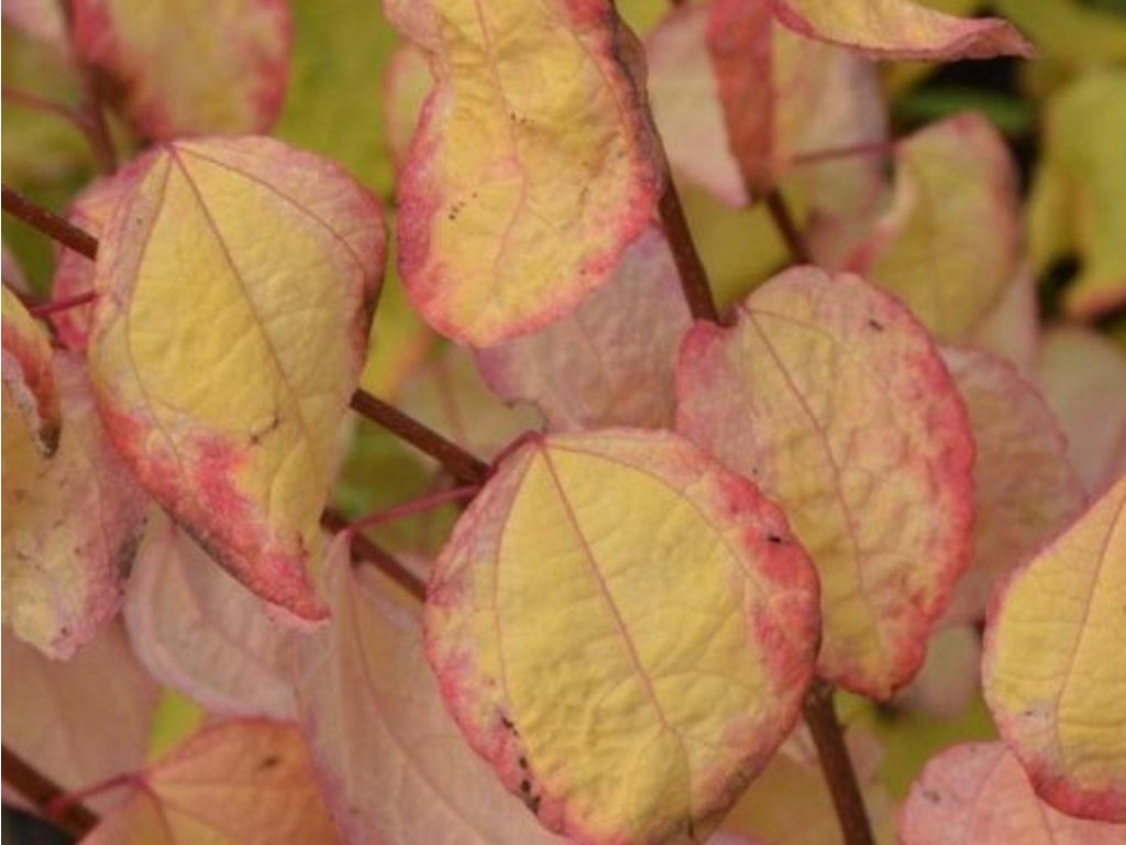 Japanischer Kuchenbaum 'Chameleon' - eine neuere Sorte, die einen langsam wachsenden, malerischen, laubabwerfenden Baum bildet. Im Erwachsenenalter erreicht er eine Höhe von 4-5 m und eine Breite von 3 m. Seine Krone ist buschig und hat eine abgerundete Form. Die Blätter sind oval-eiförmig, grün mit cremeweißer Sprenkelung. Im Herbst verfärbt er sich genau wie ein Chamäleon in die typischen Farben dieser Jahreszeit und leuchtet in orange-, rot- und rosafarbenen Tönen.