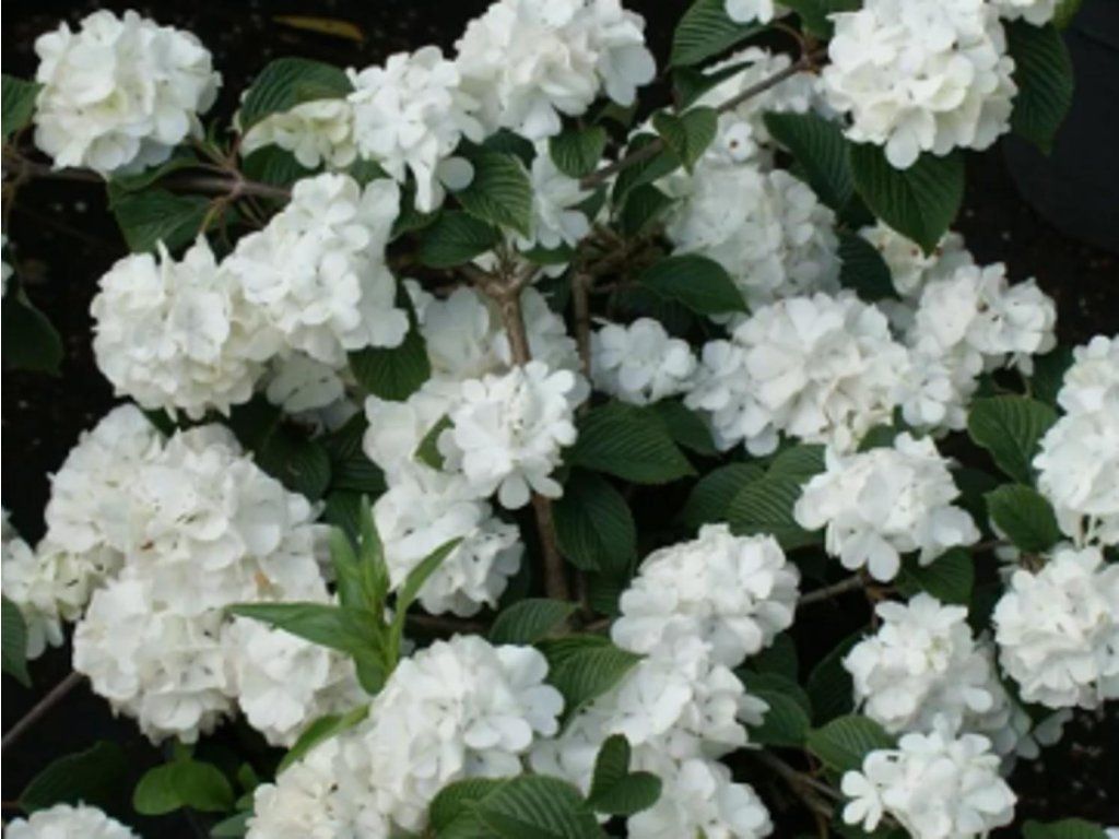 Japanischer Schneeball 'Thunberg´s Original' - sehr effektive Sorte des Japanischen Schneeballs. Wird 2 - 4 m hoch. Sterile kugelförmige Blüten sind aufrecht, sie sind weiß. Sie blühen im Laufe des Mai. Die Blätter sind länglich-eiförmig, 5-10 cm lang, beim Austreiben bronzefarben, später dunkelgrün, auf der Unterseite gräulich, behaart, mit tief eingesenkten Blattadern und weinroten Blattstielen.