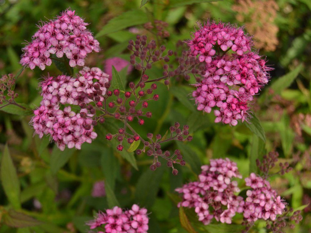 Japanischer Spierstrauch 'Anthony Waterer' - gehört zu den niedrigen, laubabwerfenden Sträuchern aus der Familie der Rosengewächse, geschätzt für seine lange Sommerblüte und sein kompaktes Wachstum. Im ausgewachsenen Zustand erreicht er eine Höhe von ca. 0,6–0,8 m und eine Breite von 0,8–1,2 m, bildet eine dichte, leicht ausladende Wuchsform mit fein verzweigten Trieben. Die Blätter sind schmal, eiförmig-lanzettlich, fein gesägt, treiben im Frühjahr oft bronzefarben bis rötlich aus, sind im Sommer tiefgrün und färben sich im Herbst gelb und orange, sodass der Strauch auch außerhalb der Hauptblütezeit interessant wirkt. Von Juni bis September erscheinen an den Enden junger Triebe flache, schirmrispenartige Blütenstände mit einem Durchmesser von etwa 5–7 cm, bestehend aus kleinen, fünfzähligen Blüten in karminroter Farbe. Blüten bieten Nektar und Pollen für Bienen, Hummeln und andere Bestäuber und eignen sich daher nicht nur für reine Ziergärten, sondern auch für naturnah gestaltete Gärten. Der Spierstrauch 'Anthony Waterer' eignet sich für den Vordergrund gemischter Strauchgruppen, als niedrige Hecke entlang von Gehwegen oder Einfahrten, als farbige Einfassung von Staudenbeeten oder in kleineren Gruppen entlang einer Terrasse. Er lässt sich gut mit blau und violett blühenden Stauden wie Salbei, Glockenblumen oder Storchschnabel sowie mit zarten Ziergräsern kombinieren, die die Struktur und Farbe der Blütenstände hervorheben.