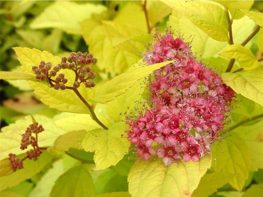 Spiraea japonica 'Candlelight' - ist ein laubabwerfender und niedriger Strauch. Sie wächst bis zu 60 cm hoch. Er bildet einen kompakten und kugelförmigen Zwergstrauch. Die Blätter sind eiförmig und gelblich gefärbt. Im Herbst verfärbt sich die Farbe in Herbsttöne. Die Blüten sind tiefrosa und in halbkugelförmigen Blütenständen angeordnet. Er blüht im Juni und Juli, nach dem Rückschnitt kann er erneut blühen.