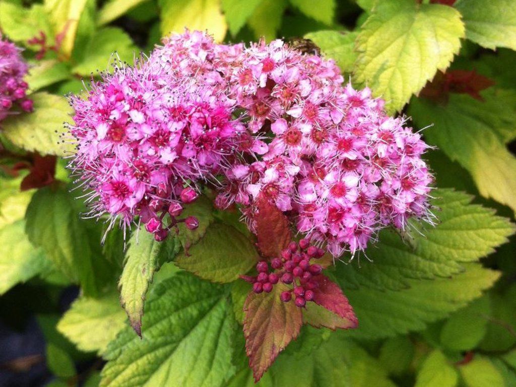 Japanischer Spierstrauch 'Magic Carpet' - gehört im Garten zu den zuverlässigsten laubabwerfenden Sträuchern für Beetränder und niedrige Einfassungen. Die Sorte 'Walbuma' wird unter dem Handelsnamen Magic Carpet vertrieben und wurde in England von David R. Tristram in der Baumschule Walberton Nursery gezüchtet. Ausgewählt wurde sie aus Sämlingen, die an die Sorte 'Goldflame' anknüpfen, als deutlich niedrigere, kompakte Form. Sie wächst dicht und breitwüchsig, meist 0,4–0,6 m hoch und 0,6–0,9 m breit, mit einem regelmäßig kissenförmigen Habitus. Die Blätter sind klein, oval und gesägt. Beim Austrieb erscheinen rote und bronzefarbene Töne, in voller Sonne überwiegt ein Goldgelb, im Halbschatten eher Gelbgrün und im Herbst kommt Kupfer bis Rot hinzu. Von Juni bis August erheben sich an den Triebspitzen doldenförmige Blütenstände von etwa 5–10 cm mit kleinen, tiefrosa Blüten. Die Blüten versorgen Insekten mit Nektar und Pollen, der Duft ist unauffällig. In Kompositionen fungiert er als heller Akzent zu Stauden, Gräsern und dunkelblättrigen Sträuchern. Er eignet sich auch gut für Gruppenpflanzungen, an Hängen und in Kübeln auf Terrassen, wo das niedrige Wachstum die Sicht nicht verdeckt. Im Vergleich zu gewöhnlichen grünblättrigen Spieren wirkt er deutlich heller und behält seine kompakte Form auch ohne häufigen Schnitt.