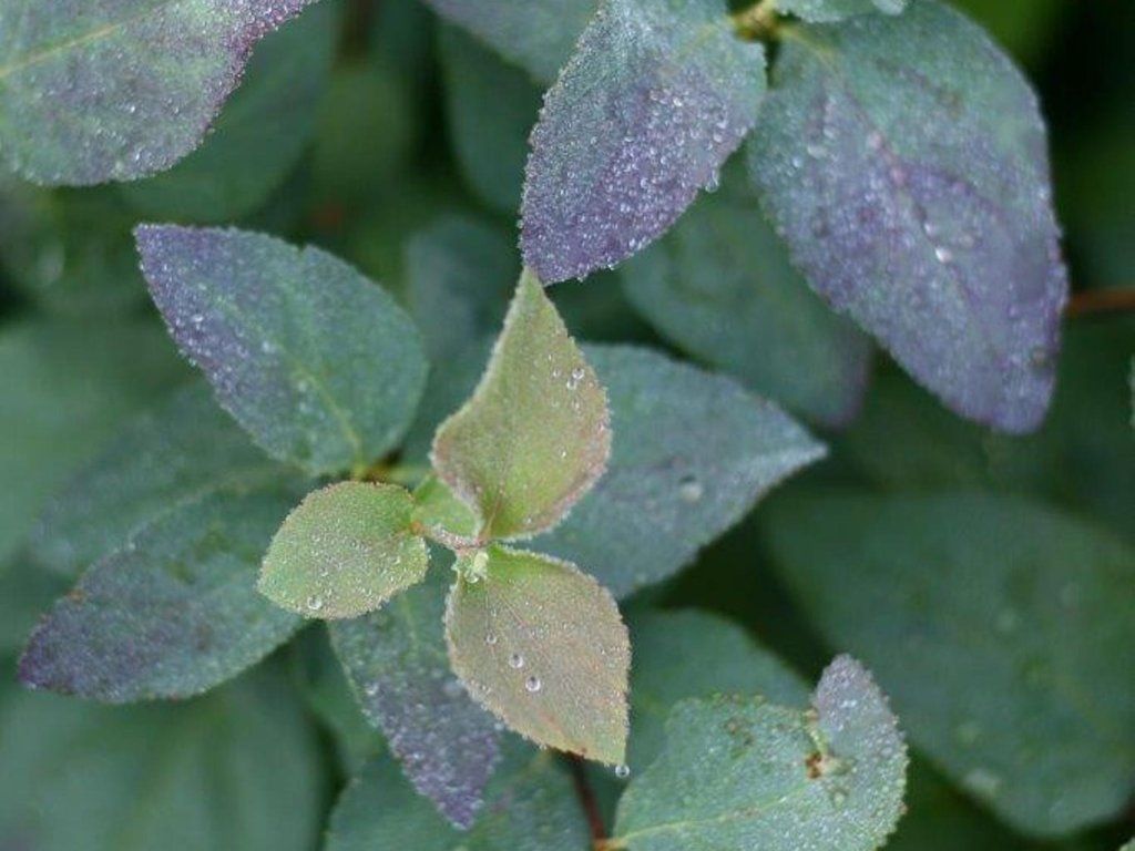 Spieren 'Blue 'Kazoo' - ein laubartiger Strauch. Wächst bis zu einer Höhe von 80 - 100 cm. Die Blätter haben einen kühlen blaugrünen Farbton. Im Frühling haben sie einen bronzefarbenen Ton, im Herbst haben sie warme Rottöne. Ab Juni blühen weiße Blüten. Nach dem Rückschnitt kann er wiederholt blühen.
