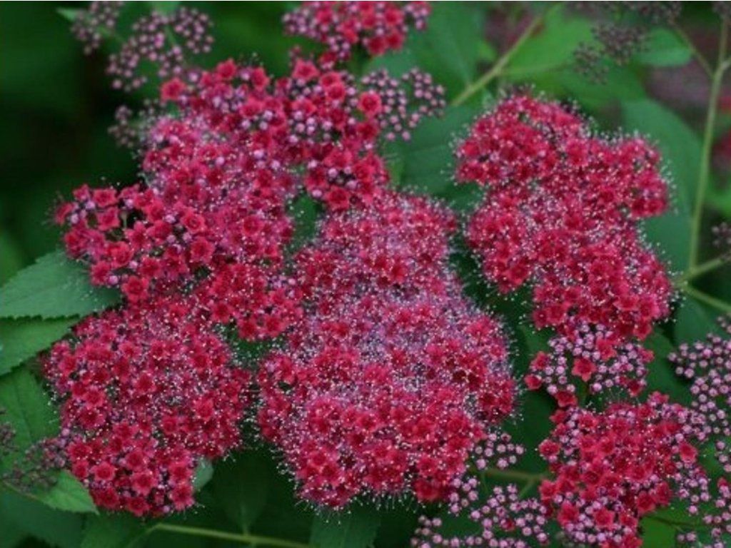 Spierstrauch 'Double Play Red' 'SMNSJMFR' - die Sorte 'Double Play Red' wird auch unter der Zuchtbezeichnung 'SMNSJMFR' verkauft. Sie stammt aus der geplanten Züchtung der Spring Meadow Nursery in Michigan, Autor ist Timothy D. Wood, die Auswahl erfolgte nach offener Bestäubung im Jahr 2007 und die Patenterteilung erfolgte 2017. Es handelt sich um einen dichten, kompakten, laubabwerfenden Strauch mit halbkugelförmigem Habitus, der im Erwachsenenalter normalerweise 0,6–0,9 m hoch und 0,6–1,2 m breit wird. Im Frühjahr treibt er auffallend weinrot bis purpurrot aus, im Sommer dunkeln die Blätter zu einem satten Grün nach und im Herbst können sie wieder einen rötlichen Ton annehmen. Von Juni bis August, manchmal bis September, trägt er flache Dolden kleiner Blüten in dunkelrosa bis rosaroter Farbe, die einen guten Kontrast zum Frühlingslaub bilden. Die Sorte eignet sich für kleinere Gärten, in Gruppenpflanzungen, an den Rändern von Staudenbeeten, entlang von Wegen und in größeren Kübeln. Sie wirkt sauber neben Lavendel, Salbei, Funkien, Zwergspieren mit gelblaubigen Sorten oder niedrigen Ziergräsern. Blüten locken Bienen und Schmetterlinge an, der Duft ist jedoch meist nicht ausgeprägt.