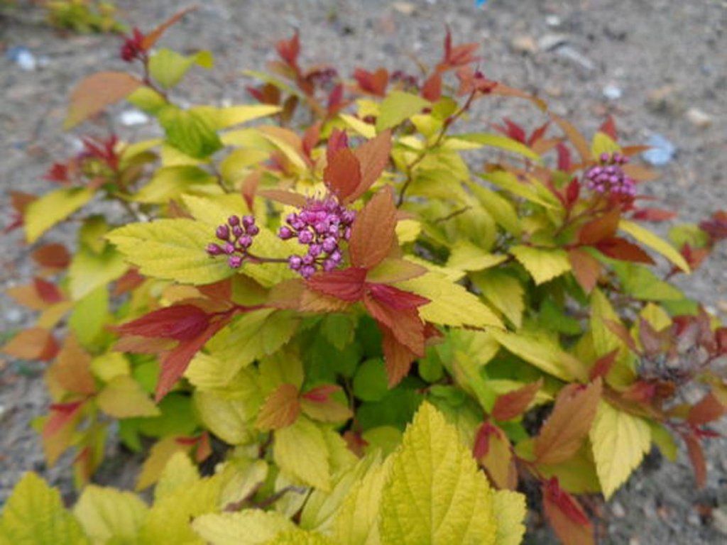 Japanischer Spierstrauch Magic Carpet 'Walbuma' PBR - erreicht eine Höhe von 60-80 cm und bildet einen kompakten, kissenförmigen Strauch. Es handelt sich um einen laubabwerfenden Strauch. Die Blätter sind einfach und haben einen gesägten Rand. Beim Austrieb sind sie leicht rötlich, nehmen dann eine goldgelbe Farbe an und sind im Herbst grün mit roten Spitzen. Kleine rosa Blüten, die zu flachen Blütenständen geformt sind, blühen von Juni bis Juli. Nach dem Rückschnitt nach der Blüte im Herbst blühen sie erneut.
