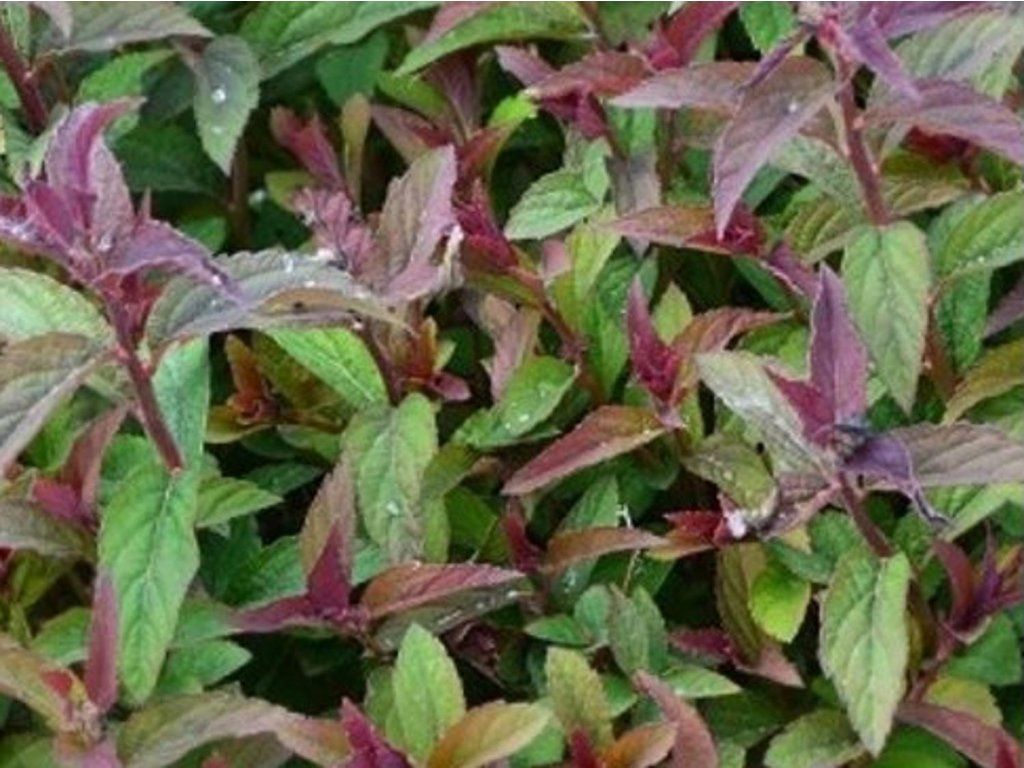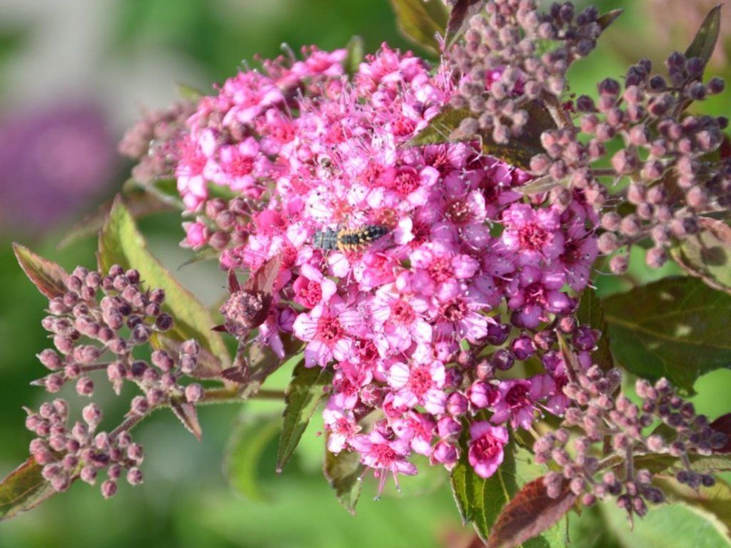 Spierstrauch Merlo Green 'Davrou01' - Laubgehölz. Er erreicht eine Höhe von 50 cm. Junge Blattaustriebe sind auf den ersten Blick violett-rot, die Farbe vertieft sich allmählich. So entsteht ein interessanter Kontrast zu den anderen Blättern, die grün sind. Im Herbst erhalten die Blätter einen bronzefarbenen Schimmer. Im Juni ist die Pflanze mit karminroten Blüten bedeckt, die bis zu 8 cm groß werden.