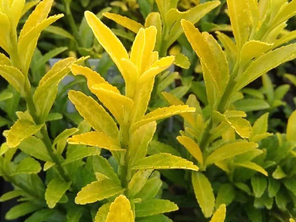 Japanischer Spindelstrauch 'Happiness' - eine immergrüne Sorte des Japanischen Spindelstrauchs, einer ursprünglich aus Ostasien stammenden Art. Diese Sorte wurde für einen kompakten Wuchs und eine ausgeprägte grün-gelbe Blattpanaschierung gezüchtet. In ausgewachsenem Zustand erreicht er eine Höhe und Breite von etwa 0,8–1,2 m. Er wächst dicht verzweigt und bildet einen kompakten, aufrechten Strauch, der auch für kleinere Räume geeignet ist. Die Blätter sind gegenständig, ledrig, 4–7 cm lang, glänzend, mit einem grünen Zentrum und einem unregelmäßigen gelben Rand, der bei jungen Trieben am ausgeprägtesten ist. Dank seines immergrünen Charakters bietet er auch während der Wintermonate Struktur und Farbakzente im Garten. Die Blüten sind klein, weißlich bis grünlich und erscheinen im Juni bis Juli, wobei der Hauptzierwert im Laub liegt. Der Kultivar wird in Kübeln, in Gruppenpflanzungen und als niedrige, geformte Hecke eingesetzt, wo er eine zusammenhängende, farblich kontrastierende Wand bildet.
