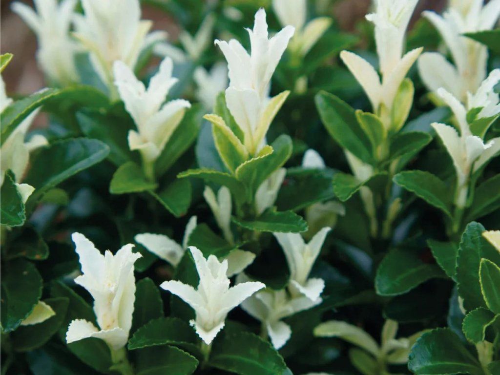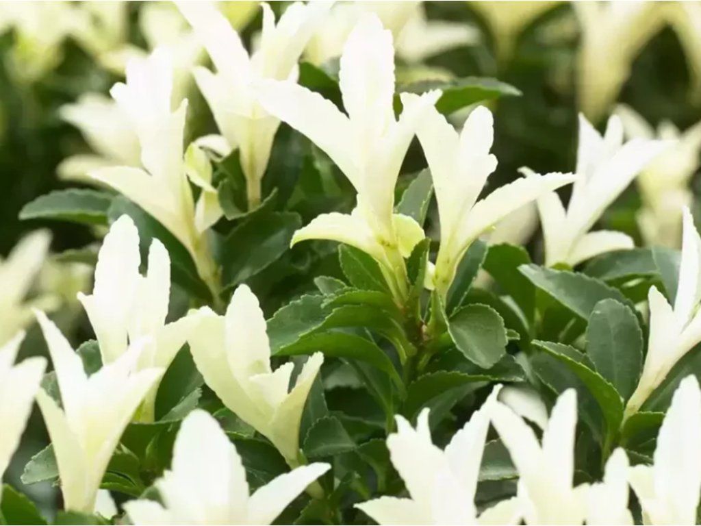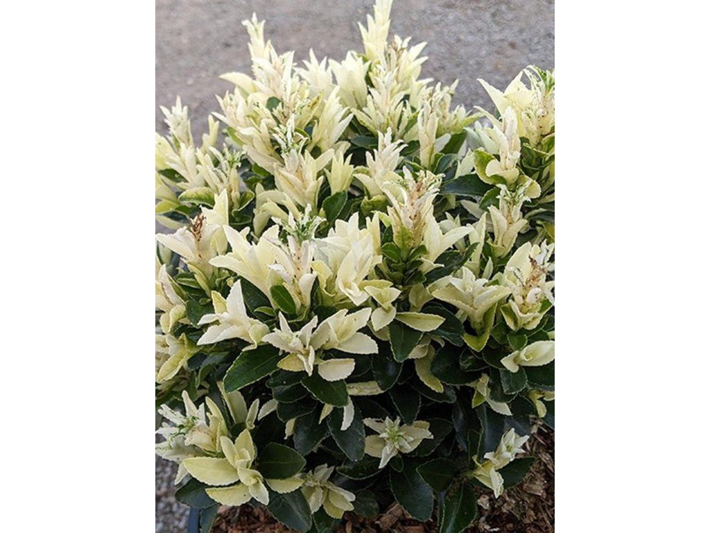Japanischer Spindelstrauch 'Paloma Blanca' - eine immergrüne Sorte des Japanischen Spindelstrauchs aus der Familie der Spindelsträucher. Die botanische Art stammt aus Japan und Korea, wo sie auch in Küstenbuschland und lichten Wäldern wächst. Die Sorte wurde von der niederländischen Baumschule Kwekerij Van Lankveld in den Verkehr gebracht und ist im Handel auch unter der Bezeichnung 'Lankveld03' mit Rechtsschutz erhältlich. Der Strauch wächst aufrecht und dicht, erreicht im Erwachsenenalter normalerweise eine Höhe und Breite von 0,5–1 m und wächst etwa 5–10 Jahre bis zu dieser Größe. Den größten Zierwert haben die neuen Triebe von März bis Anfang Juni, die cremefarben bis perlmuttweiß austreiben und allmählich in eine tiefgrüne Belaubung übergehen. Die Blätter sind klein, eiförmig, ledrig und leicht glänzend. Im Juni können unauffällige grünlich-weiße Blüten erscheinen, Früchte bilden sich im Garten nur gelegentlich, es sind meist rosa Kapseln mit einem orangefarbenen Samenmantel. Die Pflanze ist beim Verzehr potenziell schädlich, was bei Gärten mit Kindern und Haustieren zu berücksichtigen ist. Dank guter Verträglichkeit städtischer Umgebungen und Wind eignet sie sich auch für Vorgärten und Kübel in bebauten Gebieten. In Kompositionen wird sie als niedrige Hecke, Wegbegrenzung, immergrüner Akzent im Vorgarten oder als geformter Solitär im Kübel eingesetzt, wo der Kontrast des Frühlingsaustriebs mit dunklen Blättern neben Gräsern, Heidekräutern oder Nadelgehölzen mit feiner Textur zur Geltung kommt.