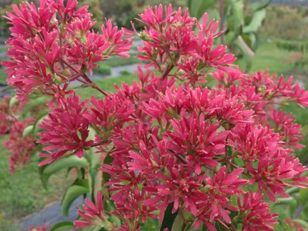 Sieben-Söhne-Baum TEMPLE OF BLOOM 'SMNHM' - stellt ein Gehölz mit kompakterem Wuchs und reicherer Verzweigung im Vergleich zur Grundart dar. In der Reife erreicht sie eine Höhe von 2–3 m und eine Breite von 1,5–2 m. Sie wächst aufrecht und bildet einen dichten, mehrstämmigen Strauch mit fester Struktur. Die Blätter sind gegenständig, breit elliptisch, 8–15 cm lang, dunkelgrün und glänzend mit deutlicher Blattaderung. Im Herbst verfärben sie sich gelblich. Die Blütezeit ist von September bis Oktober, oft bis zu den ersten Frösten. Die Blüten sind klein, cremeweiß, in auffälligen endständigen Rispen angeordnet und duften zart. Nach dem Abfallen der Blütenblätter bleiben auffällig vergrößerte Kelchblätter erhalten, die sich tiefrot färben und den Ziereffekt bis in den späten Herbst verlängern. Die Frucht ist eine kleine Achäne ohne kulinarischen Nutzen. Die Pflanze ist nicht giftig. Die Frostbeständigkeit liegt bei etwa −25 °C, was den Anbau in den meisten Gebieten ermöglicht. Im Garten eignet sie sich als Solitärgehölz, in gemischten Strauchgruppen oder als spätblühende Dominante in der Bepflanzung.