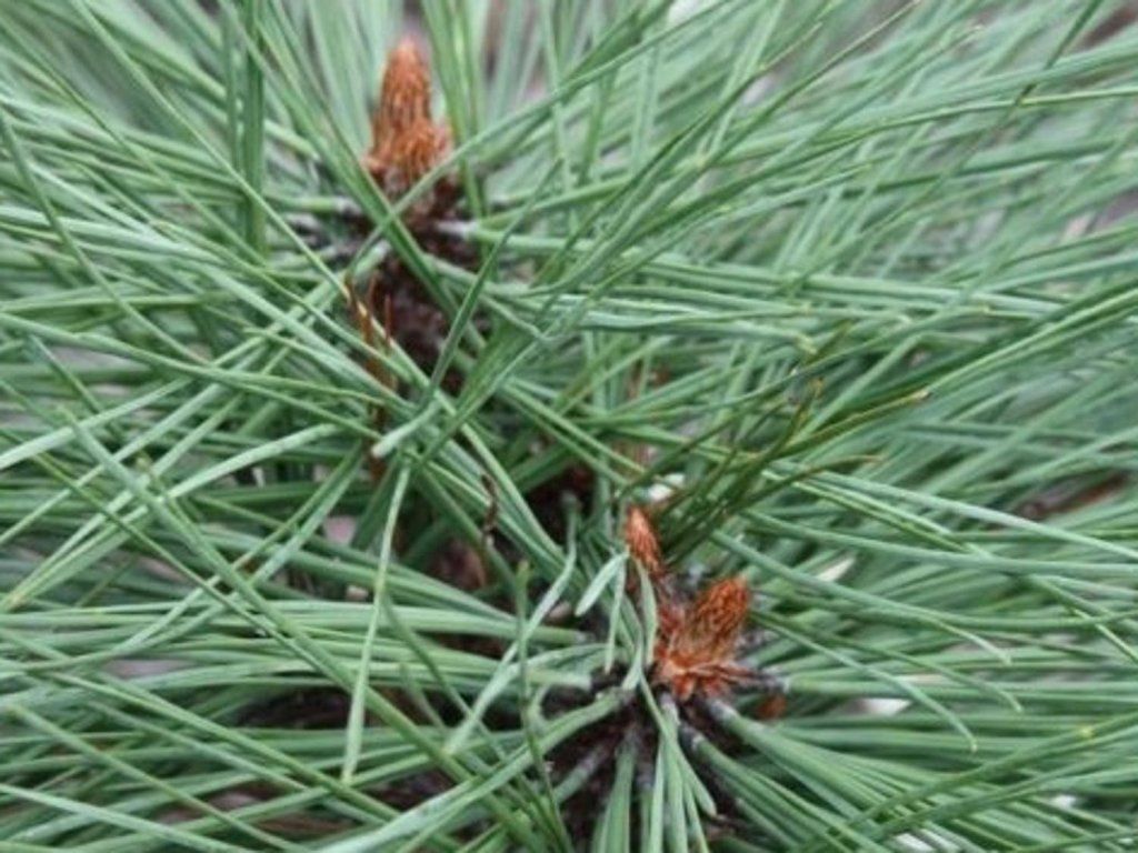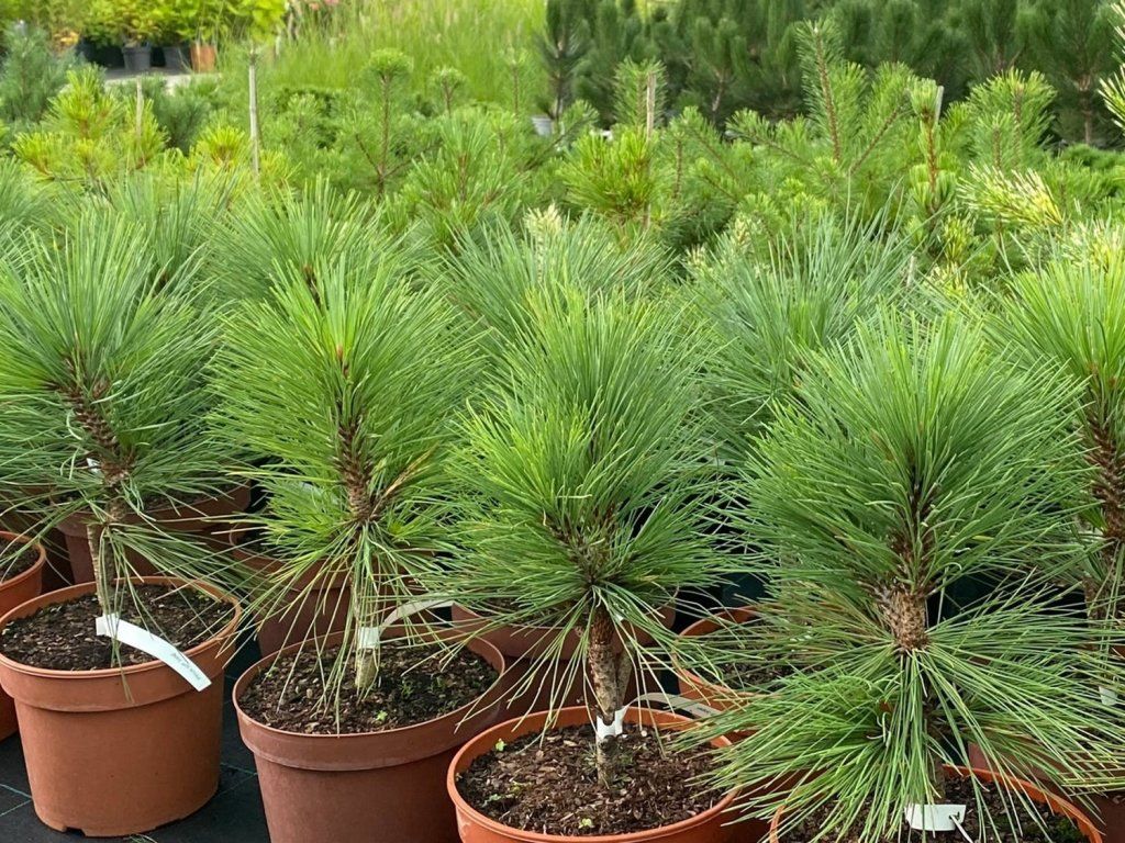 Die Jeffrey-Zirbelkiefer 'Joppi' - Der Kultivar 'Joppi' gehört zu den Zwergformen mit deutlich langsamerem Wachstum und kompaktem Habitus, die diesen alpinen Charakter in ein für kleinere Gärten geeignetes Maß übertragen. Unter unseren Bedingungen bildet er einen dichten Busch bis niedrigen Baum, zehnjährige Pflanzen erreichen normalerweise etwa 1–1,5 m, im Erwachsenenalter rechnet man mit etwa 2,5–3 m Höhe und 1,5–2 m Breite. Der Habitus ist breit kegelförmig bis unregelmäßig buschig, langfristig dicht, ohne die Notwendigkeit eines ausgeprägten Formschnitts. Die Äste sind mitteldick, biegsam und widerstehen gut der Schneelast. Die Nadeln sind zu dritt in Büscheln angeordnet, meist 12–18 cm lang, weicher, blaugrün bis mittelgrün, mit einem helleren Schimmer auf der Unterseite, der der Krone ein leicht samtiges, verfeinertes Aussehen verleiht. Beim Berühren duften die Nadeln angenehm nach Harz, besonders an warmen Tagen. Der Baum ist immergrün und bietet das ganze Jahr über eine ausgeprägte Struktur. Im Winter zeichnet sich die graubraune bis bräunliche Rinde an älteren Ästen und am Stamm aus, die mit dem Alter in größere Platten aufbricht. Im Frühjahr erscheinen unauffällige männliche und weibliche Blütenstände, aus denen sich allmählich Zapfen entwickeln, die etwa 10–15 cm lang sind und oft mehrere Saisons an den Ästen verbleiben. Der Kultivar 'Joppi' wird als Solitär in Schotter- und Heidegärten, in Steingärten, im Vordergrund höherer Nadelbäume und in naturnahen Kompositionen eingesetzt, wo er gut zu Erikas, Zwergwacholder, Berberitzen und feinen Grasbüscheln passt. Er eignet sich auch für größere Kübel auf sonnigen Terrassen, wo er die Atmosphäre einer Berglandschaft vermittelt.