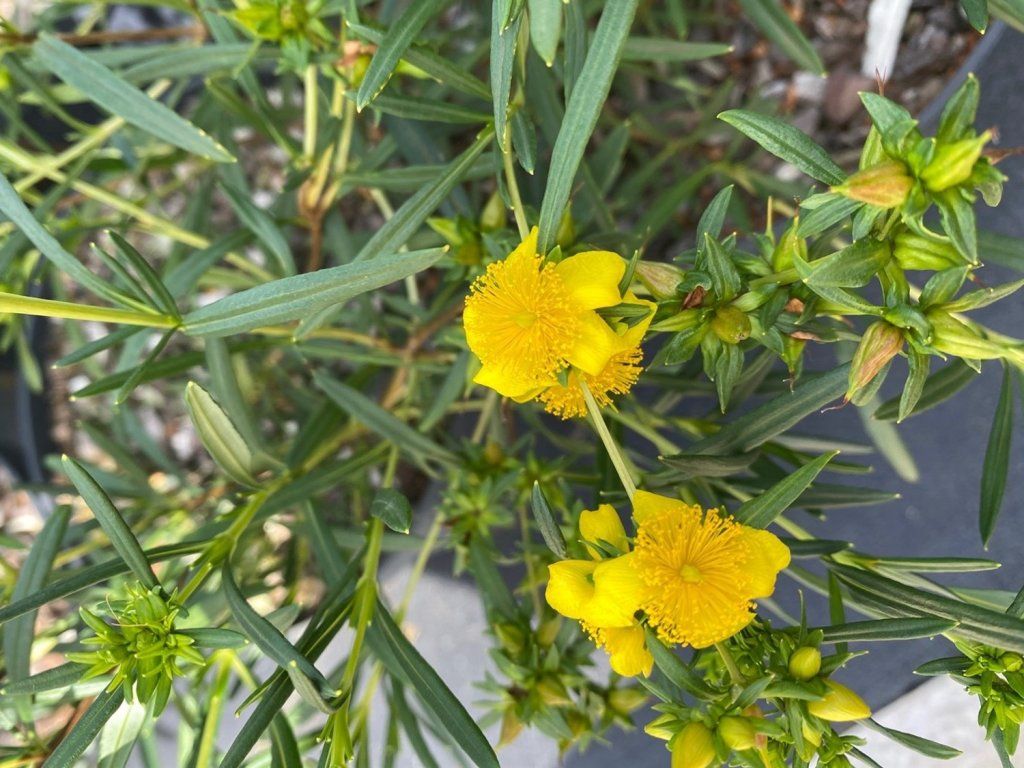 Johanniskraut 'Buttercup' - ein niedriger, laubabwerfender bis halbimmergrüner Strauch aus dem östlichen Nordamerika, der sich in Gärten wegen seiner langen Sommerblüte und kompakten Wuchsform großer Beliebtheit erfreut. Der Kultivar 'Buttercup' bildet einen dicht verzweigten, breitkugelförmigen Strauch, der normalerweise 0,8–1,0 m hoch und 0,6–1,0 m breit wird. Die Blätter sind schmal bis lanzettlich, tiefgrün, im Frühjahr oft heller, im Herbst können sie sich gelb verfärben. Von Juni, häufiger ab Juli, bis September erscheinen an den Triebspitzen zahlreiche gelbe Blüten mit einem Kranz aus Staubgefäßen, die einen zarten Duft haben und Bienen und Schmetterlinge anlocken. Nach der Blüte können sich kleine Samenkapseln und dunklere Früchte entwickeln, diese sind jedoch nicht zum Verzehr bestimmt. Im Beet eignet er sich gut als Füllung zwischen Stauden, macht sich aber auch im Unterwuchs höherer Sträucher oder als niedriger, blühender Wegsaum gut. Besonders natürlich wirkt er in Kombination mit Ziergräsern, Salbei, Fetthenne und Berberitzen. Der Strauch hat eine breit ausladende Form, manchmal leicht überhängende Zweige, was ihm ein weiches Bild in Beeten oder Kübeln verleiht.
