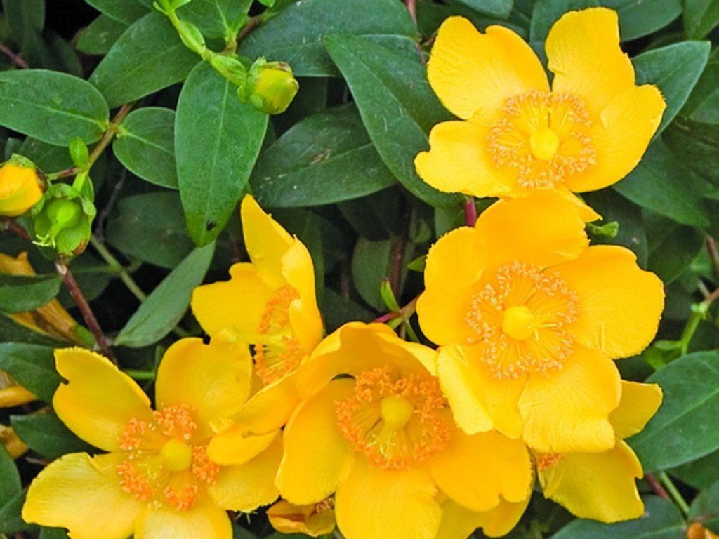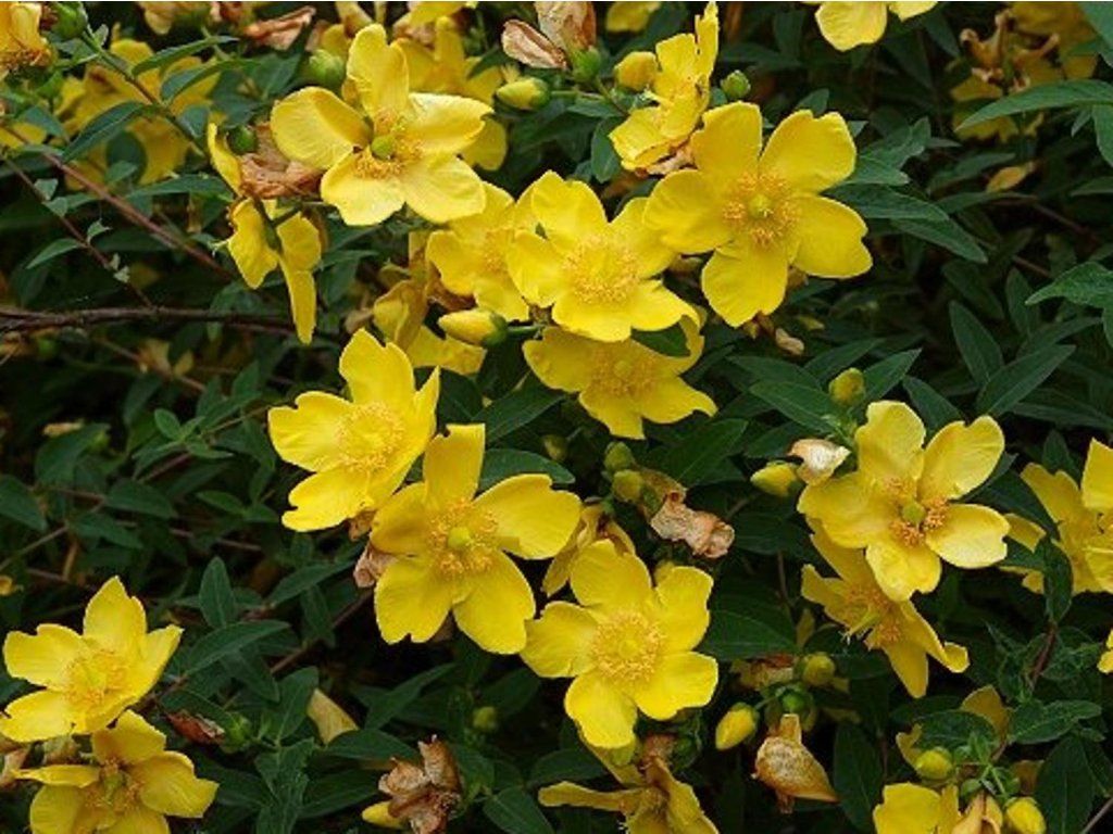 Johanniskraut 'Hidcote' - gehört zu den niedrigen bis mittelgroßen Ziersträuchern, die aus der Kreuzung asiatischer Johanniskrautarten entstanden sind, die in historischen Gärten Westeuropas kultiviert wurden. Der Strauch wächst dicht und breit und erreicht normalerweise eine Höhe von 0,8–1 m und eine Breite von etwa 1–1,2 m. Die Zweige tragen gegenständige, elliptische Blätter, die etwa 3–7 cm lang sind und eine tiefgrüne bis leicht bläulich-grüne Farbe haben. Von Juni bis September erscheinen an jungen Trieben große, goldgelbe Blüten mit einem Durchmesser von etwa 5–7 cm, die aus fünf Blütenblättern und einem auffälligen Büschel goldener Staubgefäße bestehen. Die Blüten öffnen sich nacheinander in mehreren Wellen, sodass der Strauch lange frisch aussieht und von Bienen und Hummeln aufgesucht wird. Nach der Blüte bilden sich kleine Samenkapseln, die dem Strauch auch im Spätsommer und Herbst ein feines, strukturiertes Aussehen verleihen. Das Johanniskraut wird als niedrige, frei wachsende Hecke verwendet, in Gruppen zur Hangsicherung und zur Begrenzung von Wegen und Beeten. Es lässt sich gut mit Rosen, Lavendel, Spiersträuchern und Ziergräsern kombinieren und bringt einen warmen Gelbton in die Bepflanzung. Die Gattung Hypericum ist auch aus der Heilkunde bekannt, dieser Gartenkultivar wird jedoch hauptsächlich als Zierstrauch für anspruchslose Dauerbepflanzungen verwendet.