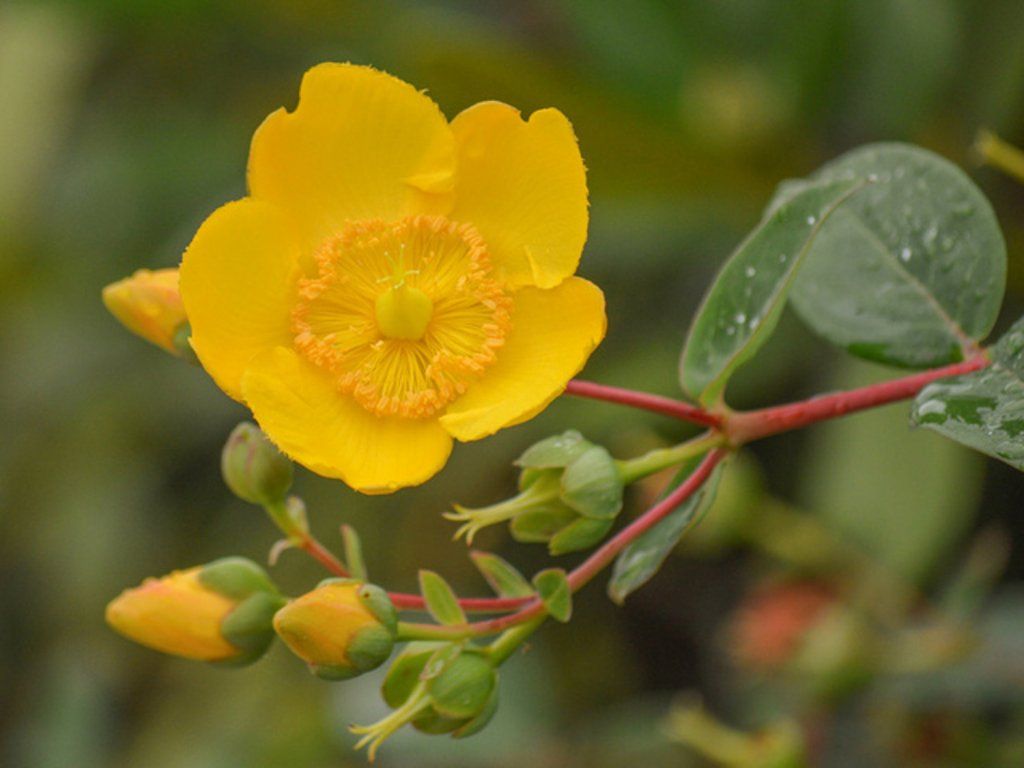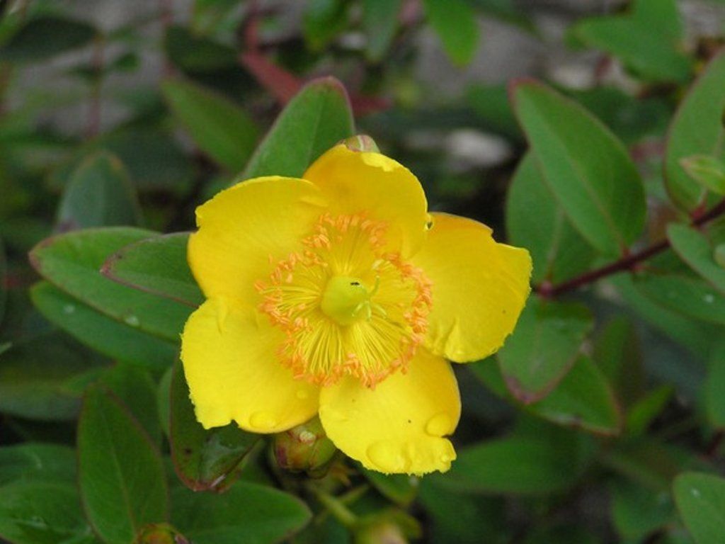 Johanniskraut 'Peter Dummer' - eine Gartenhybride, die für ihren niedrigen, ausladenden bis halbkugelförmigen Wuchs und ihre lange Sommerblüte mit gelben Blüten geschätzt wird. Im ausgewachsenen Zustand erreicht sie normalerweise eine Höhe von etwa 0,5–0,6 m und eine ähnliche Breite, unter guten Bedingungen kann sie etwas breiter werden. Das Laub ist gegenständig, oval bis elliptisch, blaugrün, überdauert in milden Wintern teilweise und verfärbt sich im Herbst oft rot. Von Juni bis September öffnen sich an den Triebspitzen große, schalenförmige Blüten von 4–6 cm, mit einem ausgeprägten Kreis von Staubgefäßen, die Pollen für Bestäuber liefern. Nach der Blüte können sich kegelförmige, rotbraune Früchte bilden, die einen späten Sommerakzent setzen, sie sind jedoch nicht essbar. Die Sorte bewährt sich als blühende Bodendecker für Hänge, unter höheren Sträuchern oder am Fuß von Hecken, wo sie den Übergang zwischen Rasen und Gehölzen mildert. In der Komposition harmoniert sie mit Lavendel, Katzenminze, Salbei und dunkelblättrigen Berberitzen. Die ideale Wahl für Gärten mit trockenerem und sonnigerem Klima.