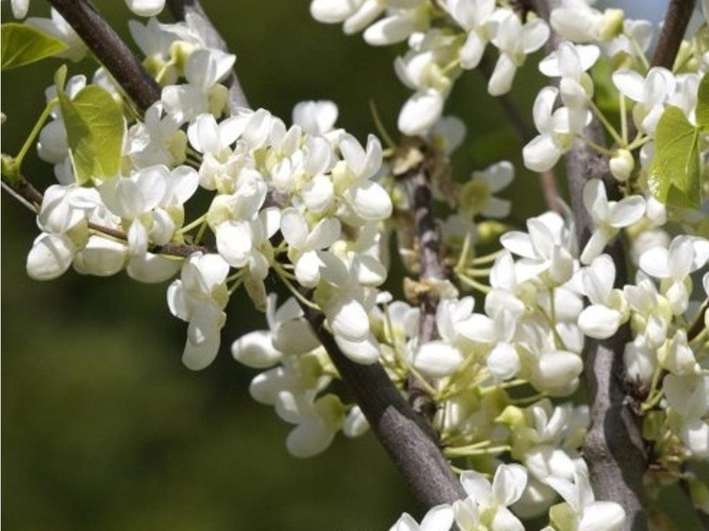 Judasbaum 'Alba' - kräftig wachsender, mittelgroßer Baum oder Strauch, der eine Höhe von 6-10 m erreicht. Die Wuchsform ist rundlich, halb offen. Die Blätter sind rundlich bis nierenförmig, von grüner Farbe. Blüht an kahlen Zweigen, noch vor dem Austreiben der Blätter. Die zarten Blüten haben eine weiße Farbe und bilden kleinere, kompakte Büschel.